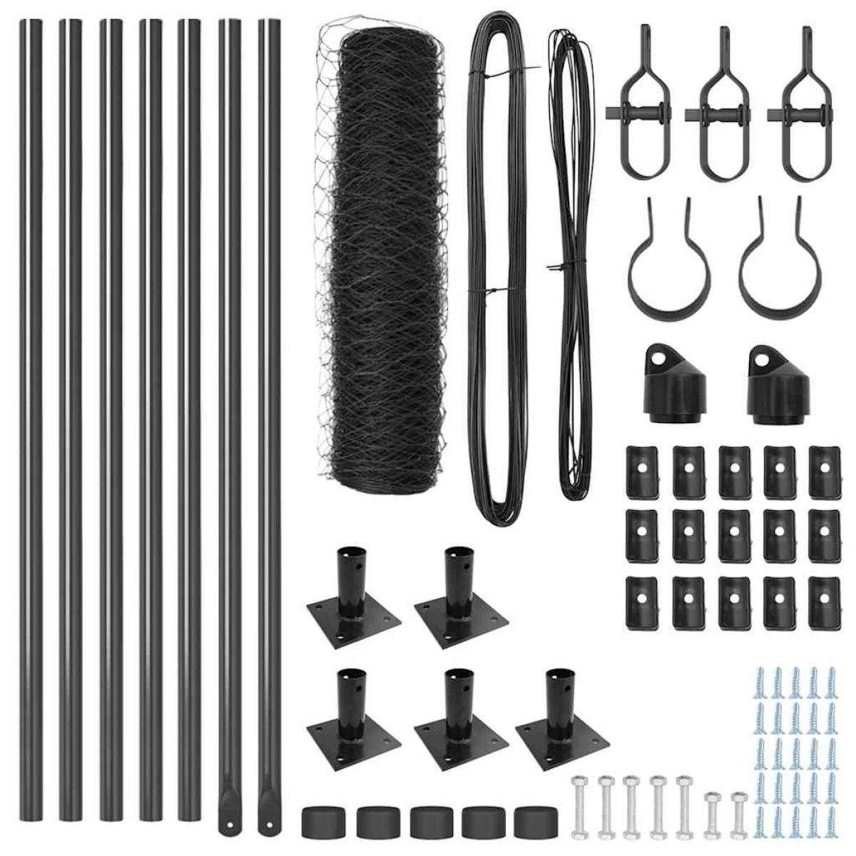 - 1 x Fence roll, 20 x Post, 8 x Angle post, 20 x Base plate, 20 x Plastic cap, 60 x Plastic tension wire supporter, 8 x Angle post cap, 8 x Angle post hardware, 12 x Tensioner, 4 x 25 m Binding wire, 4 x 33 m Tension wire