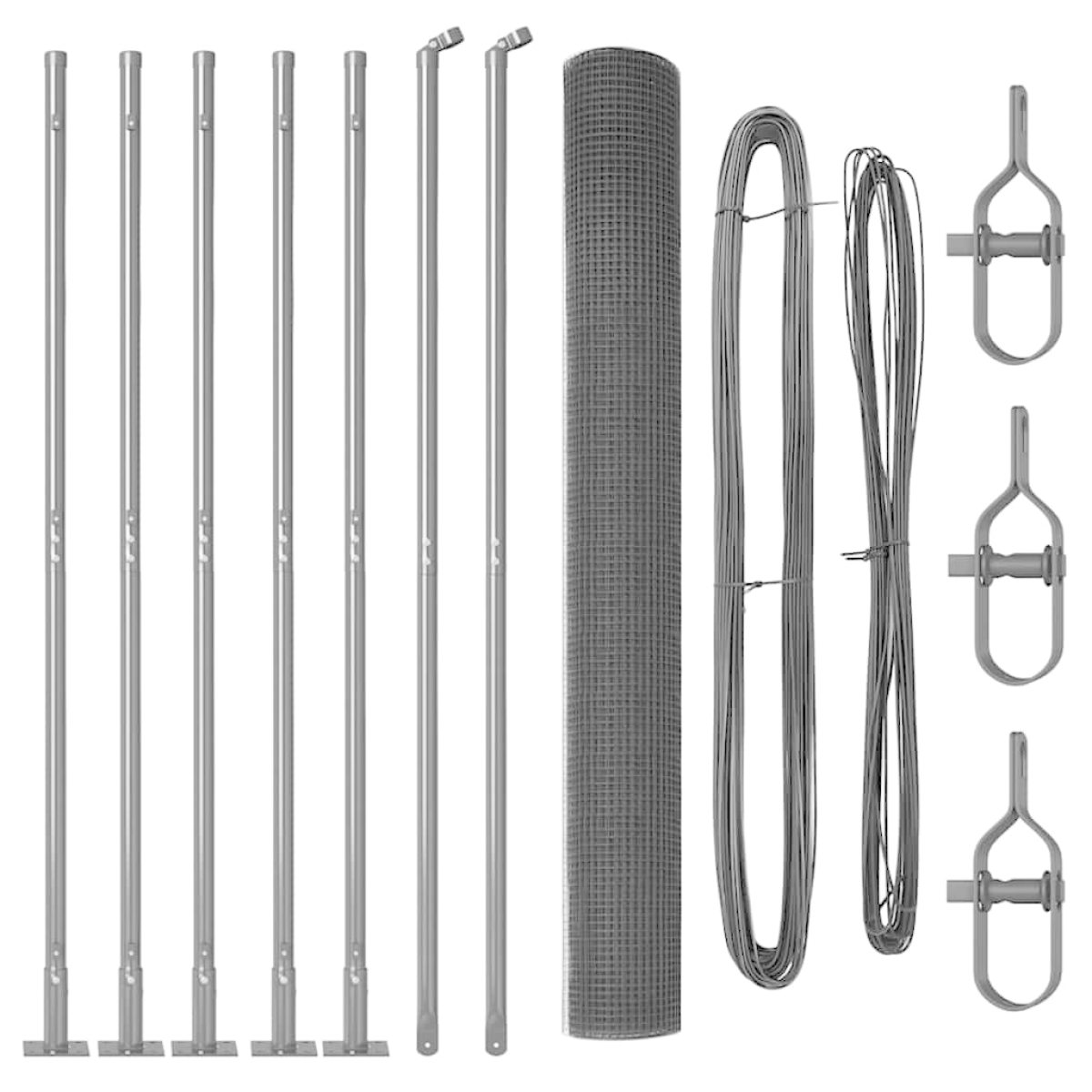 - 1 x Fence roll, 5 x Post, 2 x Angle post, 5 x Base plate, 5 x Plastic cap, 15 x Plastic tension wire supporter, 2 x Angle post cap, 2 x Angle post hardware, 3 x Tensioner, 1 x 25 m Binding wire, 1 x 33 m Tension wire