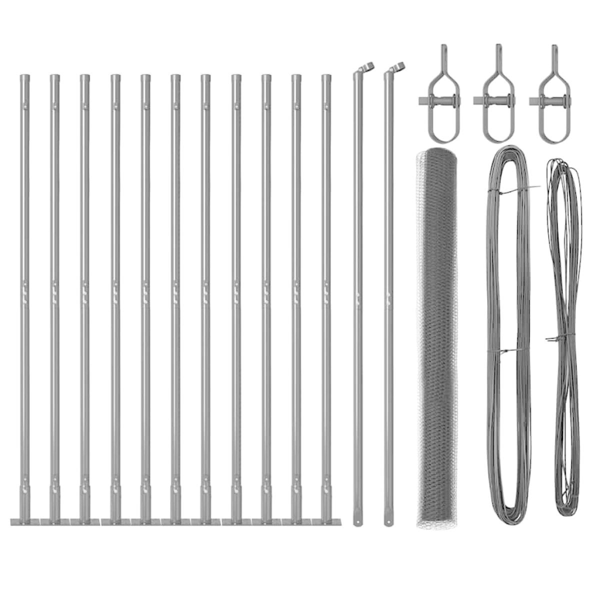 • 1 x Fence roll, 11 x Post, 2 x Angle post, 11 x Base plate, 11 x Plastic cap, 33 x Plastic tension wire supporter, 2 x Angle post cap, 2 x Angle post hardware, 3 x Tensioner, 1 x 25 m Binding wire, 1 x 80 m Tension wire