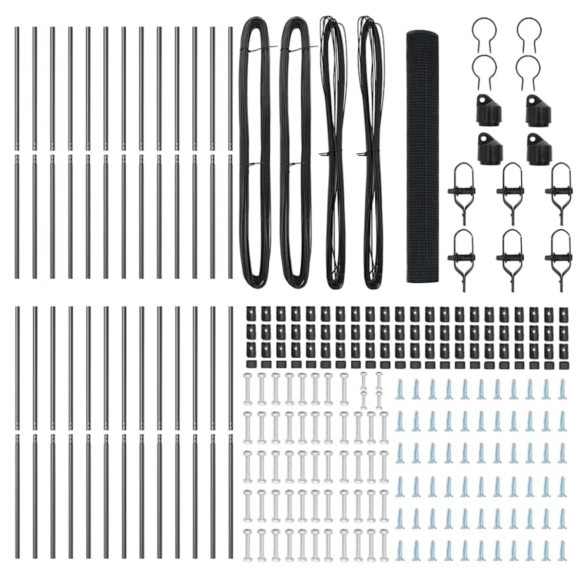- 1 x Fence roll, 22 x Post, 4 x Angle post, 22 x Plastic cap, 66 x Plastic tension wire supporter, 4 x Angle post cap, 4 x Angle post hardware, 6 x Tensioner, 2 x 25 m Binding wire, 2 x 80 m Tension wire