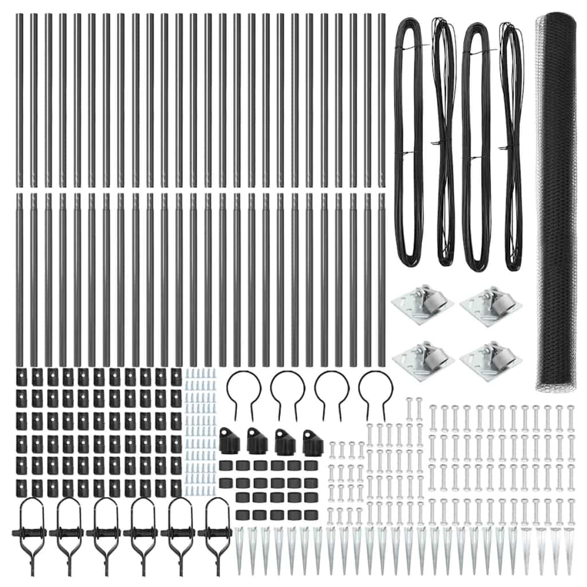 - 3 rolls of mesh, spike anchor fix, 6 posts, 3 sets of mounting fixtures.
