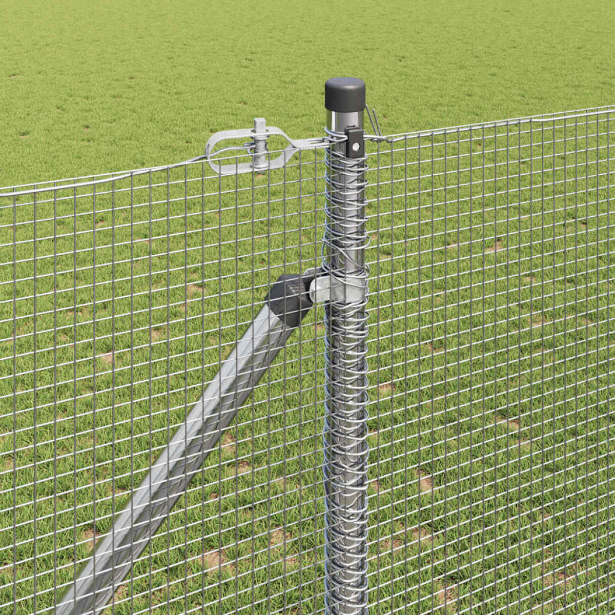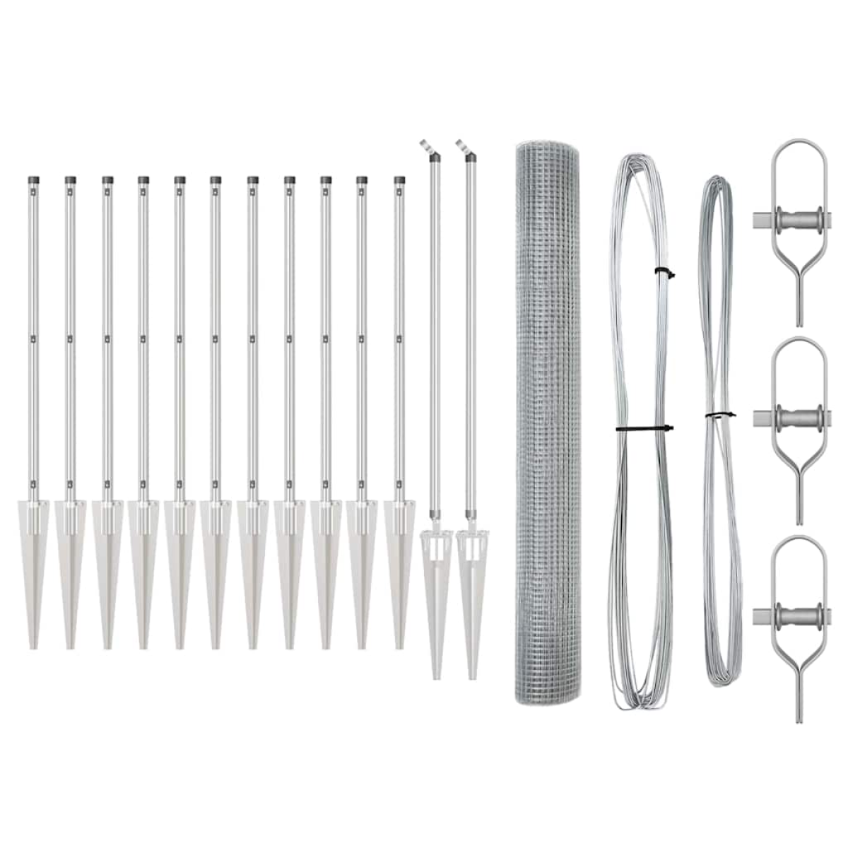- 1 x Fence roll, 11 x Post, 2 x Angle post, 11 x Spike, 2 x Angle spike, 11 x Plastic cap, 33 x Plastic tension wire supporter, 2 x Angle post cap, 2 x Angle post hardware, 3 x Tensioner, 1 x 25 m Binding wire, 1 x 80 m Tension wire