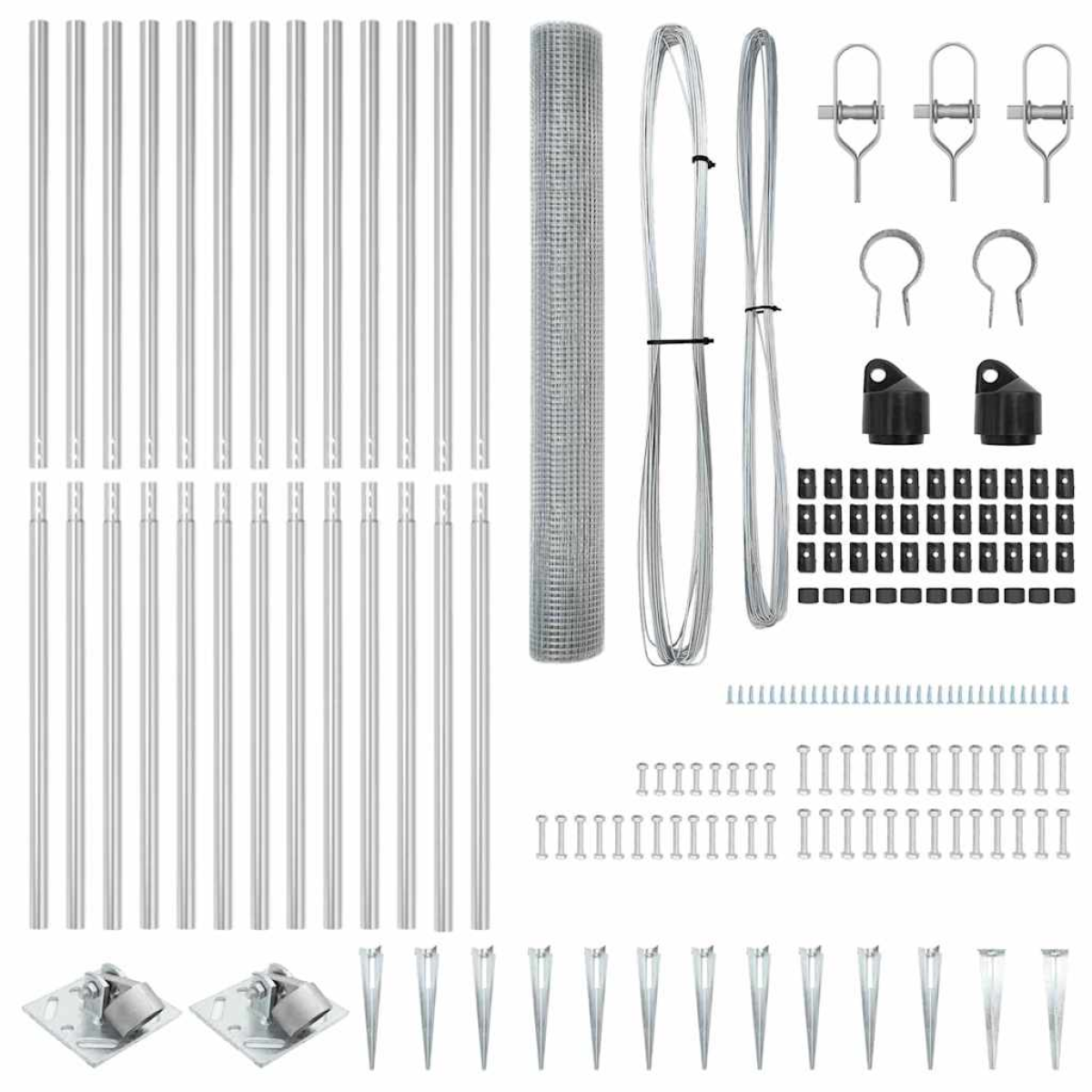 - 1 x Fence roll, 11 x Post, 2 x Angle post, 11 x Spike, 2 x Angle spike, 11 x Plastic cap, 33 x Plastic tension wire supporter, 2 x Angle post cap, 2 x Angle post hardware, 3 x Tensioner, 1 x 25 m Binding wire, 1 x 80 m Tension wire