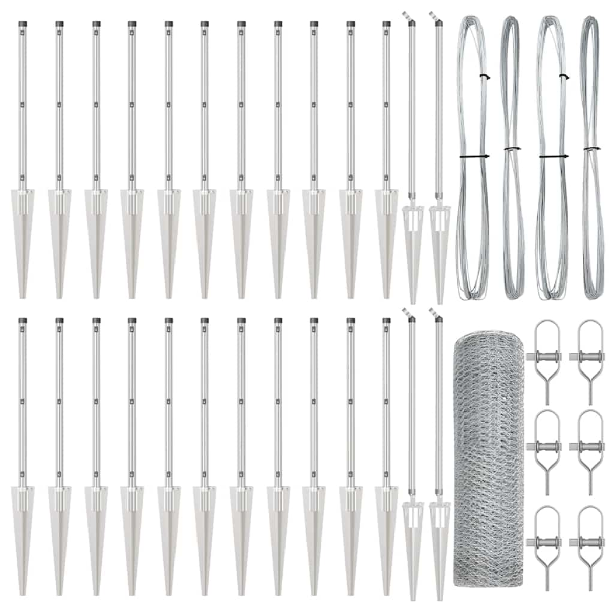 • 1 x Fence roll, 11 x Post, 2 x Angle post, 11 x Spike, 2 x Angle spike, 11 x Plastic cap, 33 x Plastic tension wire supporter, 2 x Angle post cap, 2 x Angle post hardware, 3 x Tensioner, 1 x 25 m Binding wire, 1 x 80 m Tension wire