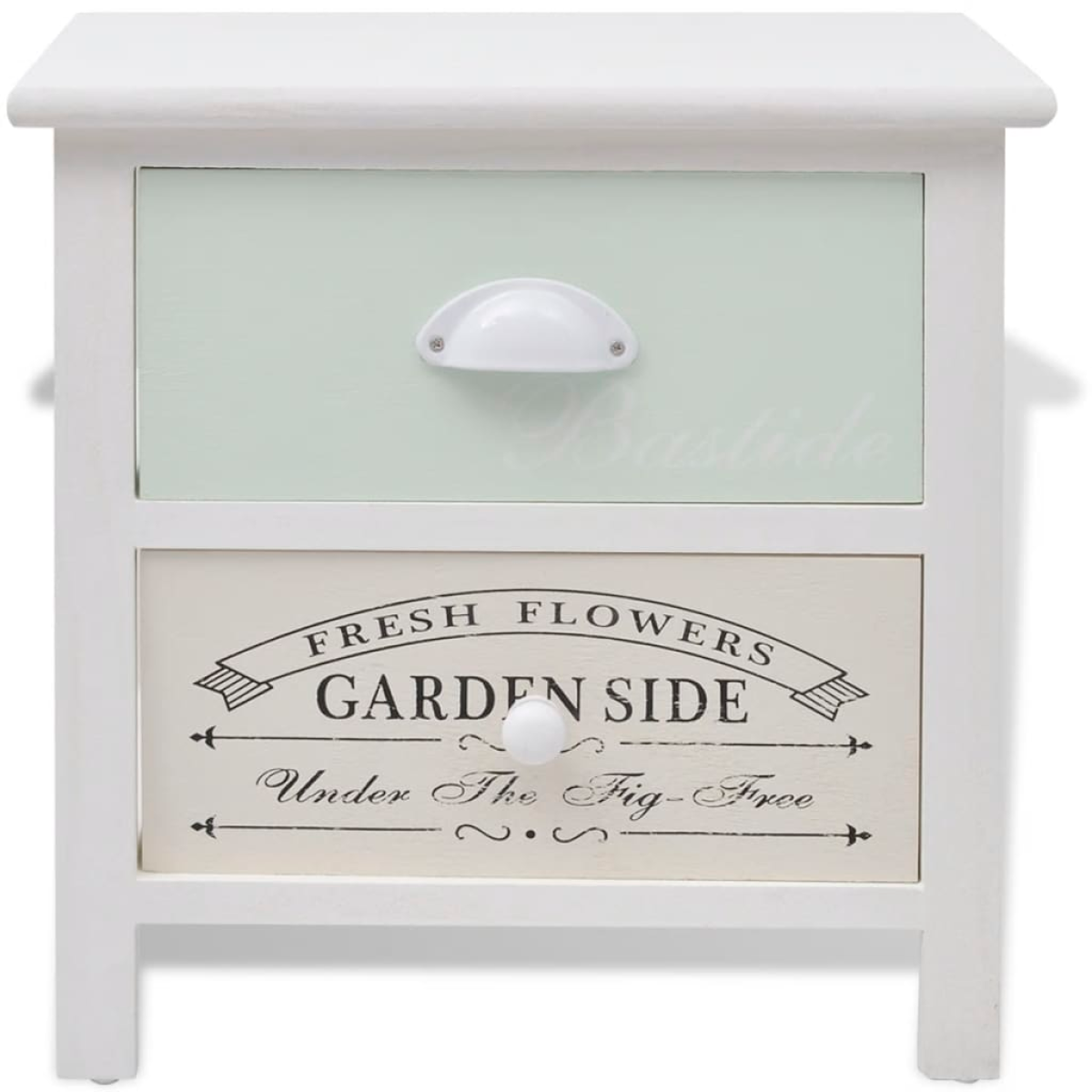 Add a touch of rustic charm to your home with these chic wooden bedside cabinets in a classic wooden French country house style! They can also be used as telephone stands, side cabinets, small cabinets, drawer cabinets, storage cabinets, nightstands, night cabinets, bedroom cabinets, end tables, end cabinets, etc. These compact cabinets each have 2 smoothly running drawers, which provide ample space for keeping smaller items organised and within reach. The drawers with vintage country-style prints add to the rural charm of the cabinet. The drawers can be exchanged. Made of high-quality materials, the cabinets are durable and easy to clean. Delivery includes 2 bedside cabinets.