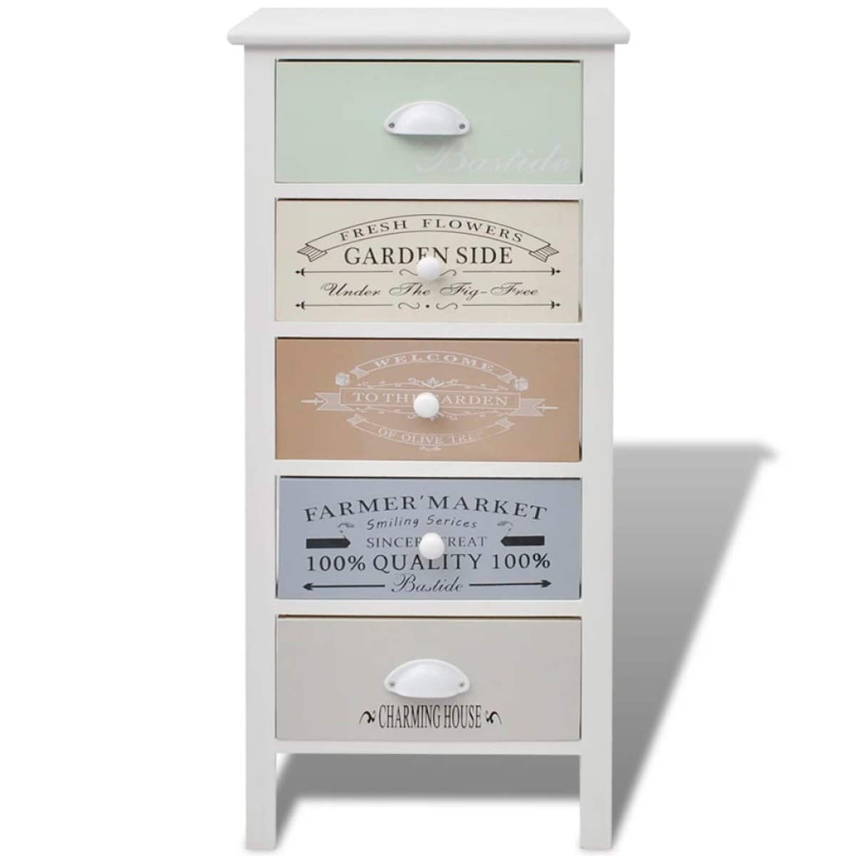 Add a touch of rustic charm to your home with this chic wooden storage cabinet in a classic French country style! This drawer cabinet has 5 smoothly running drawers, which provide ample storage space for your personal belongings and will help keep your room tidy. The drawers with vintage country-style prints add to the rural charm of the cabinet. The drawers can be exchanged. You can also display things such as photos, books and potted plants on top of the hall cabinet. Made of high-quality materials, the side cabinet is durable and easy to clean.