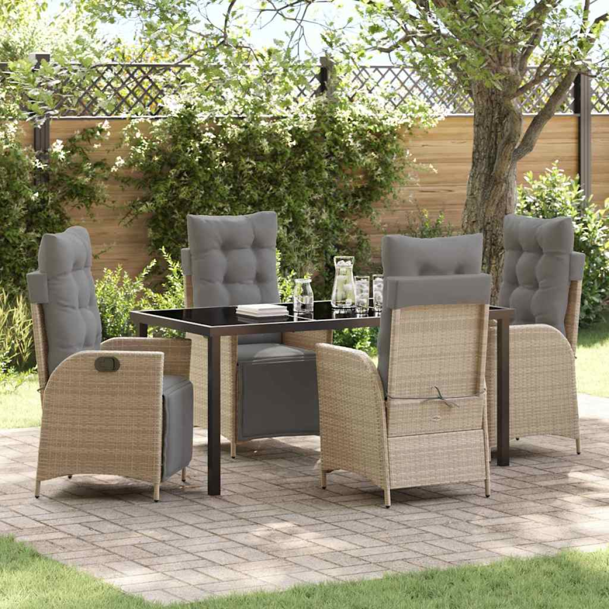 This adjustable garden dining set takes outdoor lounging and dining to the next level with its sleek and modern style, all about clean lines and keeping it simple. Perfect for gardens and terraces, this set brings a contemporary feel to any outside area, making it ideal for summer get-togethers and family meals. The black woven texture pairs nicely with the powder-coated metal, giving you a stylish and durable set-up that can handle whatever the weather throws at it, while still keeping comfy for all. Premium Materials: Crafted from poly rattan and powder-coated steel, this set is all about weather resistance and durability. The poly rattan has a nice woven texture that’s just right for outdoor vibes, and the powder-coated steel gives you a solid frame that stands up to changing seasons. Adjustable Features: Enjoy your comfort with adjustable footrests and a handle that lets you change the levels easily. This flexibility makes for a cosy experience whether you’re dining or just lounging about. Components & Design: The reclining chairs have removable seat cushions, made with comfy polyester and handy zipper closures for easy cleaning. The tempered glass top gives you a sleek surface that ties in with the modern style of the set. Versatile Use: Perfect for any garden or terrace, this set is ideal for outdoor dinners or just chilling out in the sun. Its modern look fits in well with all sorts of decor styles, making it a hit with anyone into contemporary design. Easy Care: To keep this set looking sharp, just use a cover when it’s not in use, and go for machine-washable covers for the cushions to make upkeep super easy. This way, it stays visually appealing with minimal fuss.