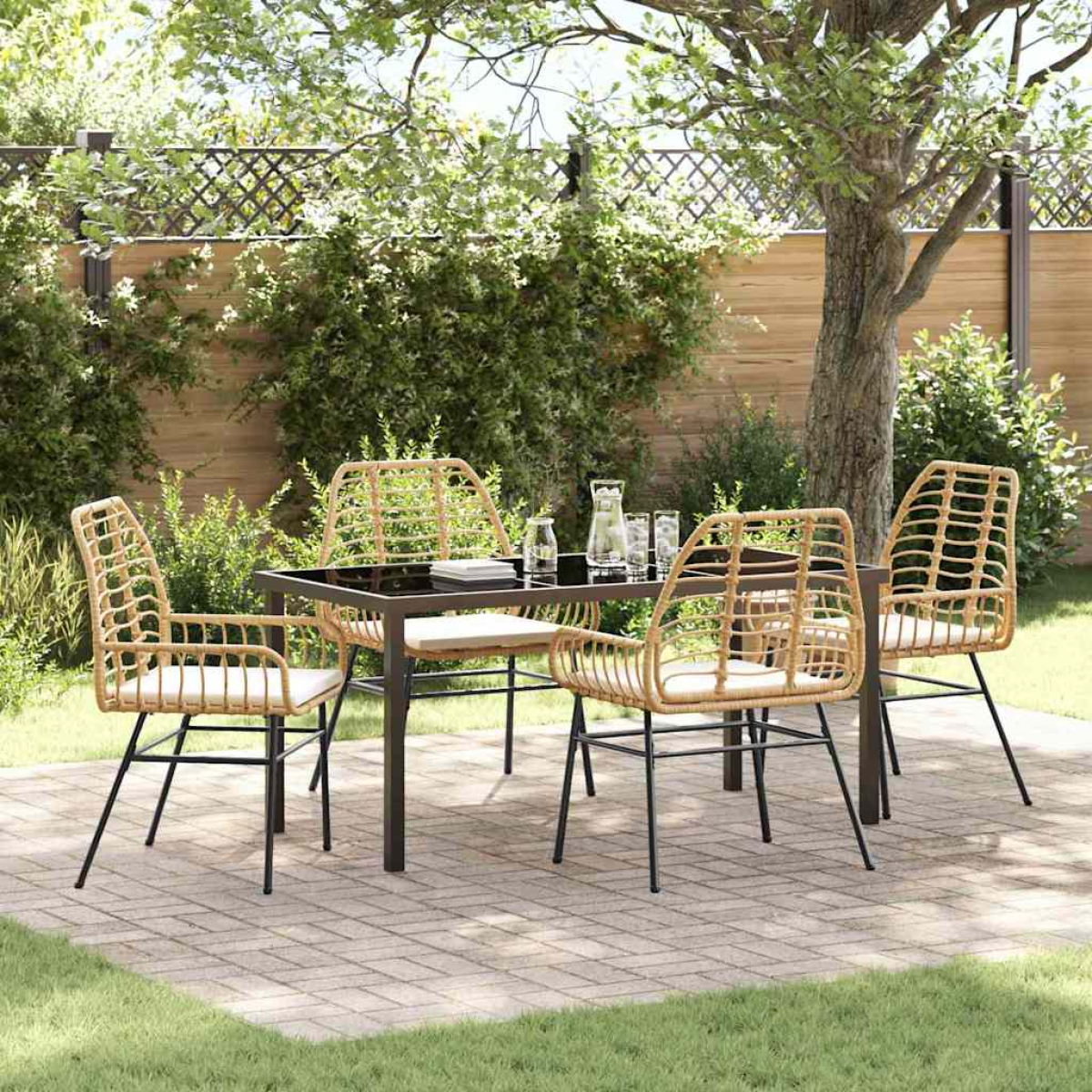 This Modern Garden Dining Set shouts sleek elegance with its tidy lines and minimalist vibe, making it the perfect choice for outdoor dining in the summer. Crafted for those who love style without the fuss, this set meets practical needs while looking fab, blending right in with your garden or terrace. Whether you’re having mates over or enjoying a meal outside, it’s designed to be comfy and easy on the eye. Sturdy Steel Frame: Built to last, this dining set gives you solid support. Steel’s tough and weather-resistant, making it perfect for the outdoors, so it can handle changing temperatures without a hitch. Stylish Glass Top: The glass surface brings a modern touch, shining in the sunlight for a bright dining experience. It’s a breeze to clean too, staying looking smart with hardly any effort, great for daily use or fancy dinners. Comfy Poly Rattan Armrests: Ergonomically shaped for relaxed arms, these poly rattan armrests don’t just look good; they feel good too, providing some extra cushioning while you sit. Summer-Ready Design: Made especially for those sunny days, the materials and build ensure you can chill outside comfortably. It’s perfect for hot weather and fits right in with your summer decorations. Easy Care: To keep it looking lovely for ages, just cover it when you’re not using it. This keeps it safe from the elements, dust, and any potential damage.