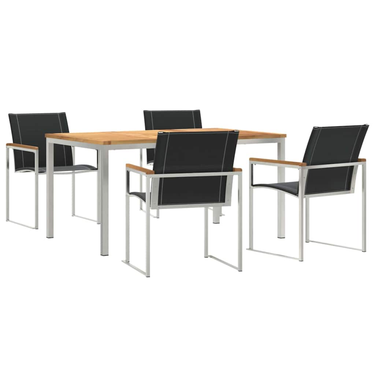 This Modern Outdoor Dining Set is a welcoming addition to any garden or terrace, ideal for family dinners or lazy weekend brunches. Its sleek design, with clean lines and minimal fuss, fits perfectly into any outdoor space. Made for outdoor use, this set is notable for its toughness against the weather and stylish look. Materials: The garden dining set combines a strong steel frame with a wooden table, giving you both durability and natural beauty. The stainless steel adds long-lasting quality and resists wear and tear from the elements, making this set a smart choice for your garden. Included Components: You'll find a slatted wooden tabletop that lets rainwater drain away, stopping any pooling. The strong steel frames mean stable seating and dining experiences, and every bit is made to boost durability, usefulness, and looks. Features / Function / Design: With solid construction, this set is safe to use even in different weather. The sleek, slatted table not only looks modern but also keeps water from sitting on it. With its strong steel frame, this set blends function with style for a smart outdoor dining area. Recommended Uses: Perfect for gardens and terraces, this dining set is just right for outdoor fun or quiet family meals. Its modern vibe fits well with contemporary outside aesthetics. Create a comfy spot in your outdoor area for dining, reading, or just soaking in nature. Care & Maintenance: To keep it lasting longer, use a waterproof cover when it’s not in use. For the metal bits, just wipe them down with a damp cloth and dry them well. This regular care will keep your garden furniture looking lovely all year round.