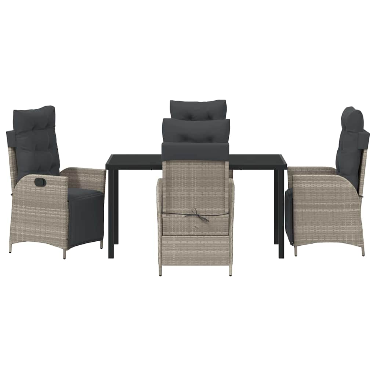 This adjustable garden dining set takes outdoor lounging and dining to the next level with its sleek and modern style, all about clean lines and keeping it simple. Perfect for gardens and terraces, this set brings a contemporary feel to any outside area, making it ideal for summer get-togethers and family meals. The black woven texture pairs nicely with the powder-coated metal, giving you a stylish and durable set-up that can handle whatever the weather throws at it, while still keeping comfy for all. Premium Materials: Crafted from poly rattan and powder-coated steel, this set is all about weather resistance and durability. The poly rattan has a nice woven texture that’s just right for outdoor vibes, and the powder-coated steel gives you a solid frame that stands up to changing seasons. Adjustable Features: Enjoy your comfort with adjustable footrests and a handle that lets you change the levels easily. This flexibility makes for a cosy experience whether you’re dining or just lounging about. Components & Design: The reclining chairs have removable seat cushions, made with comfy polyester and handy zipper closures for easy cleaning. The tempered glass top gives you a sleek surface that ties in with the modern style of the set. Versatile Use: Perfect for any garden or terrace, this set is ideal for outdoor dinners or just chilling out in the sun. Its modern look fits in well with all sorts of decor styles, making it a hit with anyone into contemporary design. Easy Care: To keep this set looking sharp, just use a cover when it’s not in use, and go for machine-washable covers for the cushions to make upkeep super easy. This way, it stays visually appealing with minimal fuss.
