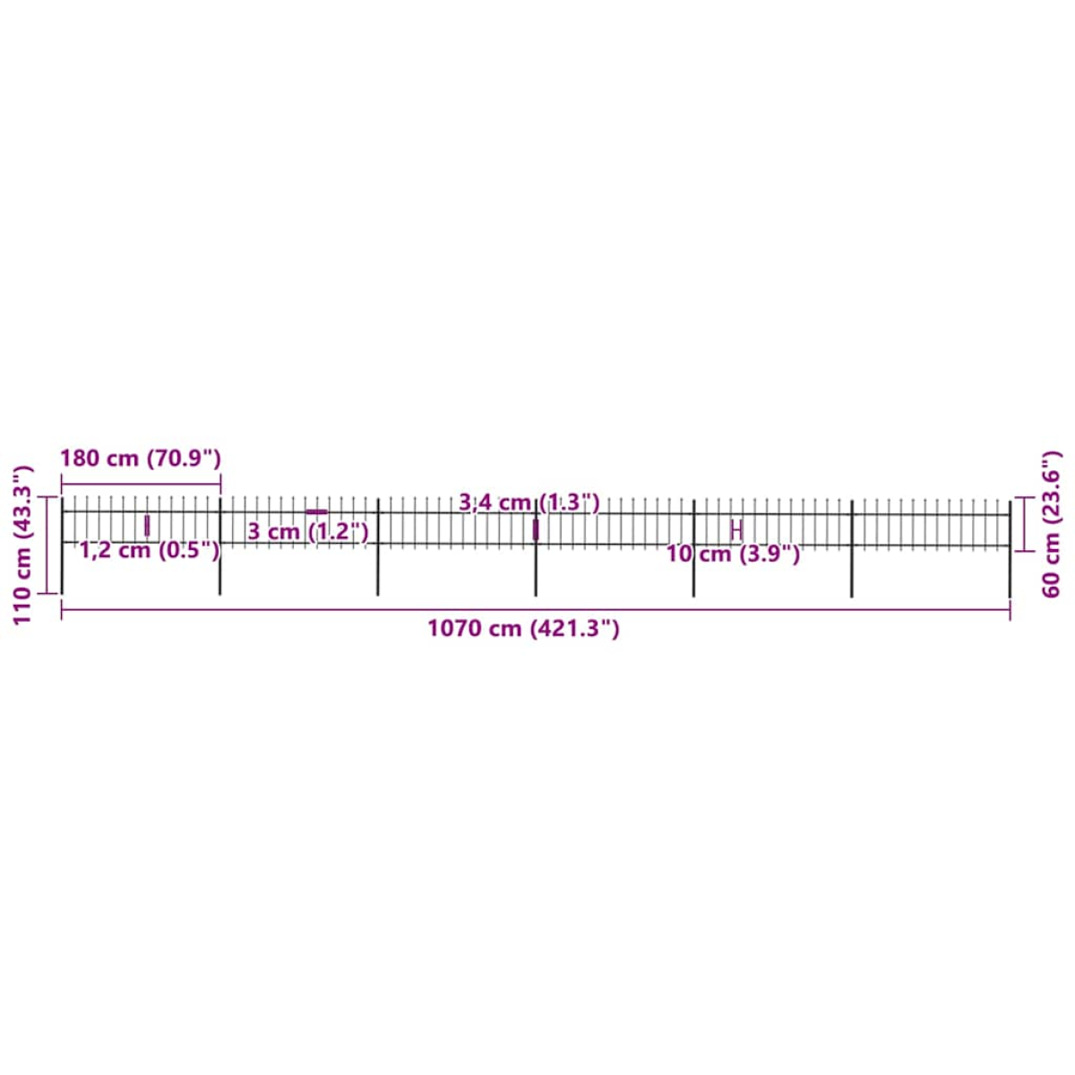 Create an elegant fence around your garden, home, or walkway with our garden fence! Our decorative steel garden fence, consisting of 6 fence panel and 7 posts, has a total length of 10.2 metres. It will form a sturdy, safe and maintenance-free perimeter barrier for your garden, home, or business property. With vertical bars topped with spear ends and strong horizontal brace as reinforcement to the frame, our garden fence will provide a high degree of security. Manufactured from heavy-duty, powder-coated steel, the outdoor fence is exceedingly stable, sturdy and durable. Thanks to the included mounting materials, the garden fence is easy to assemble. Note: You can buy more sets to make the fence as long as you like.
