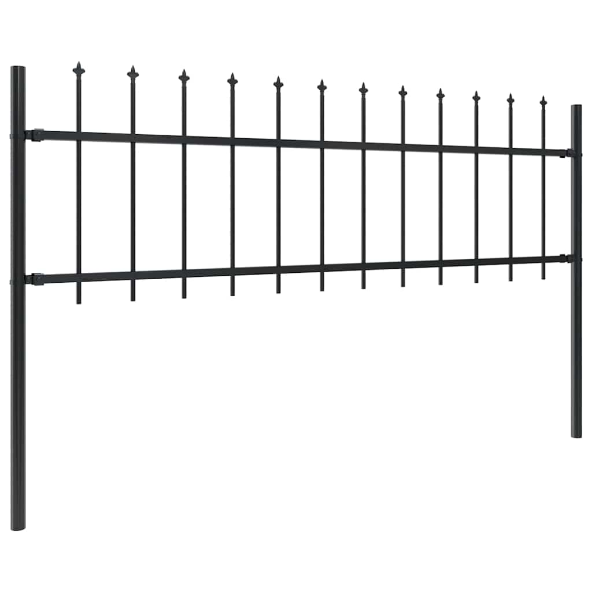 Create an elegant fence around your garden, home, or walkway with our garden fence! Our decorative steel garden fence, consisting of 2 fence panel and 3 posts, has a total length of 3.4 metres. It will form a sturdy, safe and maintenance-free perimeter barrier for your garden, home, or business property. With vertical bars topped with spear ends and strong horizontal brace as reinforcement to the frame, our garden fence will provide a high degree of security. Manufactured from heavy-duty, powder-coated steel, the outdoor fence is exceedingly stable, sturdy and durable. Thanks to the included mounting materials, the garden fence is easy to assemble. Note: You can buy more sets to make the fence as long as you like.