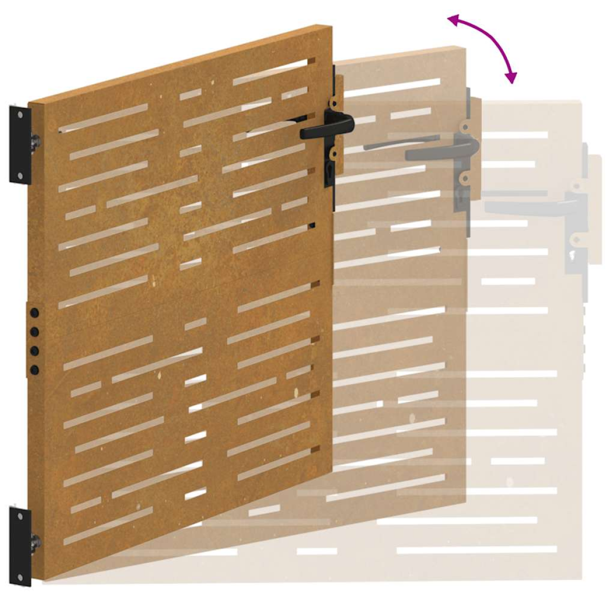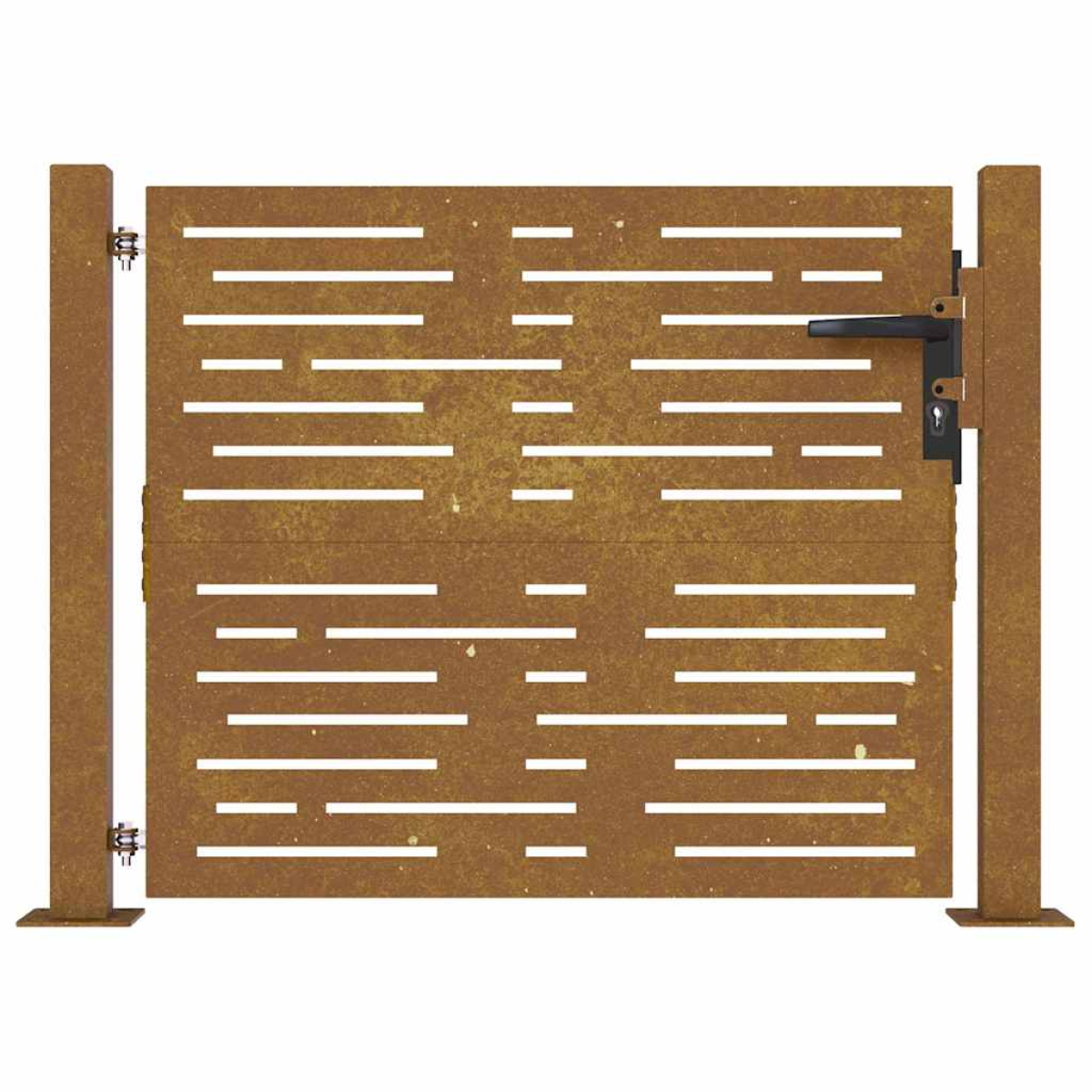 This garden gate, featuring a perfect combination of strength and elegance, makes an ideal entry point for the fence around your garden or patio. Durable material: The metal gate is made of corten steel. Corten steel, also known as weathering steel. This is anti-corrosive by its very nature. It develops a rusty protective layer against corrosion when first exposed to atmospheric conditions. Thus, you don't need to paint it. This can help you save on maintenance and repair costs. The distinctive brown colour on the corten steel will surely be an eye-catcher. Finally, weathering steel is exceptionally durable and will stand up to the test of time. Laser-cut design: The side gate has a beautiful laser-cut design that adds a special charm to your home.Lockable system: The steel gate is equipped with a lockable system for extra security.Stable base: The 4 mounting holes in the base of the gate post allow you to fix it to the ground for added stability. Good to know:This product should be assembled.The gate frame is not included in the delivery.This product is not rusted yet and has a normal metal colour when you receive it, but rust will develop over time. You could speed up the rusting process by spraying it with soap water and salt water. To keep your clothes stain-free, avoid contact with the developing rust layer.