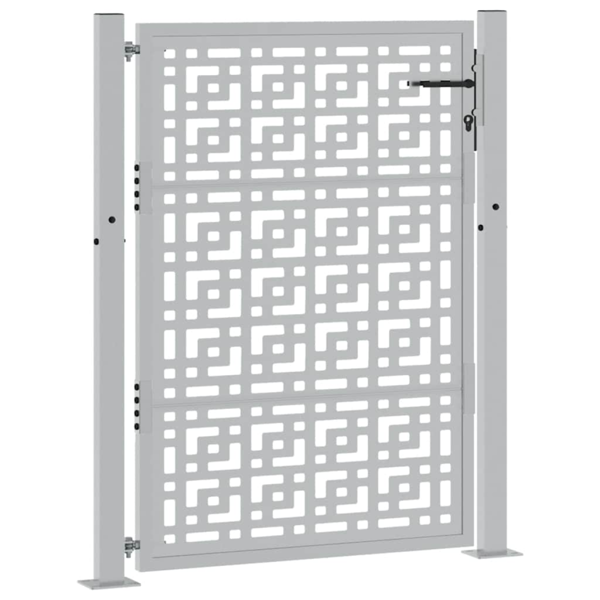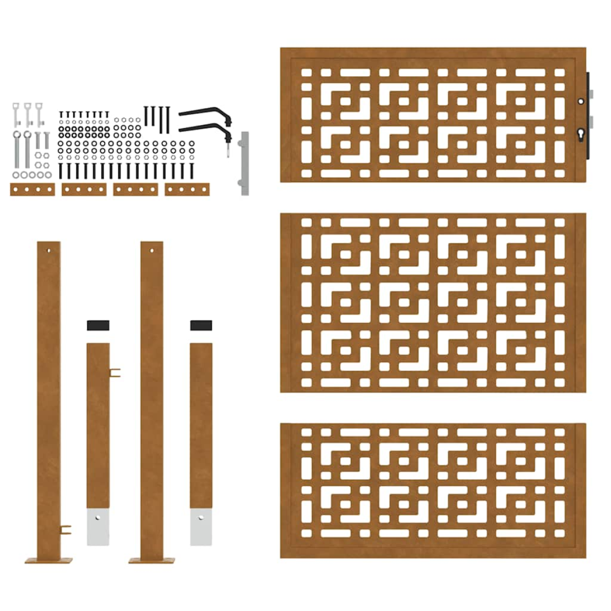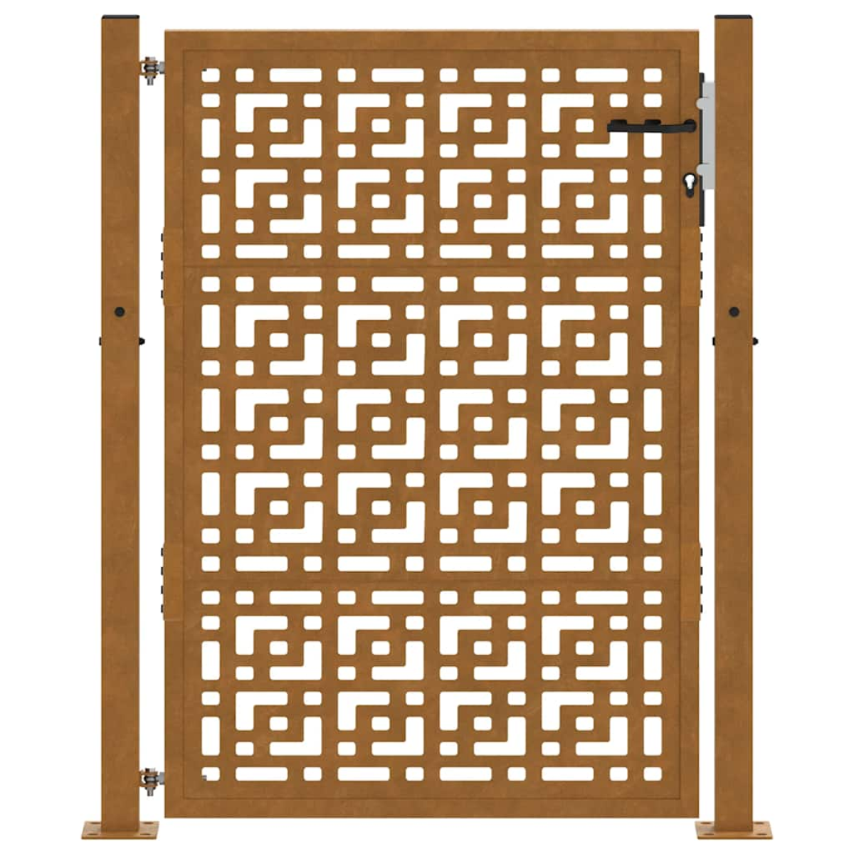 This garden gate, featuring a perfect combination of strength and elegance, makes an ideal entry point for the fence around your garden or patio. Heavy-duty construction: This fence gate is made of weathering steel. Weathering steel is anti-corrosive by its very nature. It develops a rusty protective layer against corrosion when first exposed to atmospheric conditions. Thus, you don't need to paint it. This can help you save on maintenance and repair costs. The distinctive brown colour on the weathering steel will surely be an eye-catcher. Finally, weathering steel is exceptionally durable and will stand up to the test of time.Laser-cut design: The security gate has a beautiful laser-cut design that adds a unique charm to your home.Lockable design: The outdoor gate is equipped with a robust locking system that comes with three matching keys, guaranteeing that the patio gate can be securely locked.Easy to assemble: The entrance gate comes complete with two posts with flange plates and mounting accessories for easy installation.Wide applications: The metal gate is perfect for enhancing garden entrances, driveways, and any property boundaries, combining functionality and visual appeal. Good to know:This product is not rusted yet and has a normal metal colour when you receive it, but rust will develop over time. You could speed up the rusting process by spraying it with soap water and salt water. To keep your clothes stain-free, avoid contact with the developing rust layer.