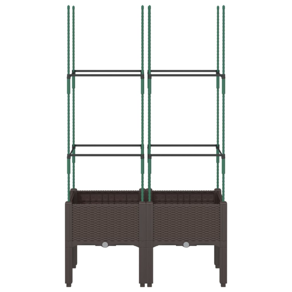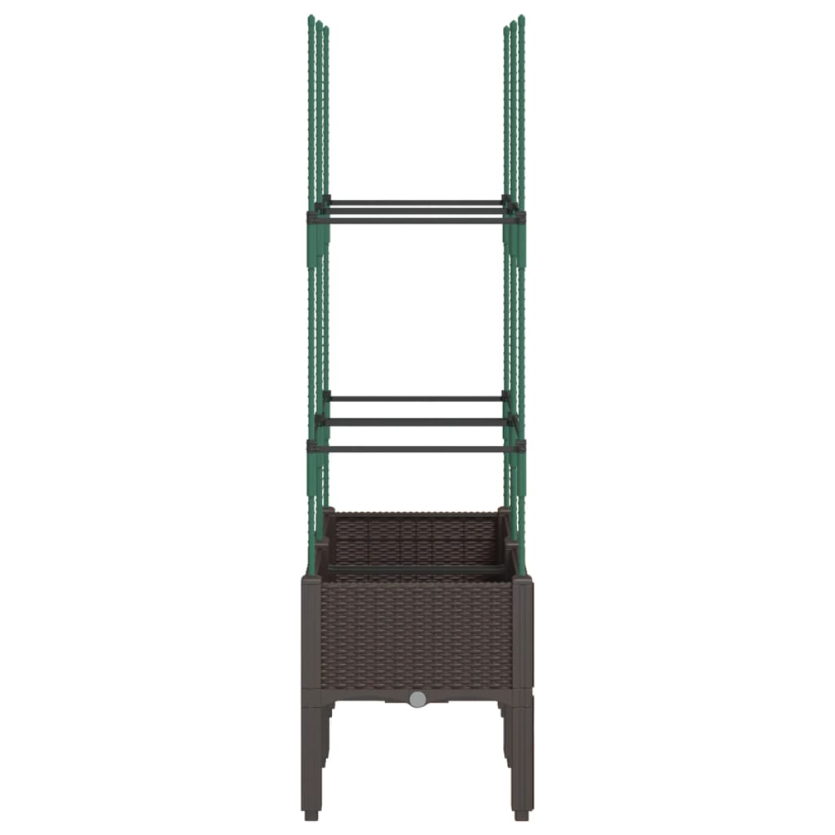This garden planter with trellis is an excellent choice for climbing plants in your garden, patio and terrace. Durable material: Polypropylene is a popular plastic that is also one of the most used materials in outdoor furniture. It's lightweight, tough, and resistant to impact.Generous capacity: The outdoor planter provides plenty of space for growing all your vegetables, flowers and other plants.Practical design: The ideal bottom layer helps retain moisture and allows for easy drainage. Additionally, the integrated trellis offers great support for growing climbing plants such as tomatoes, peas, and roses.Beautiful rattan look: The patio planter is designed with a rattan look, bringing an elegant charm to your living space.Elevated design: The elevated design of this planter box can protect your plants from weeds and pests.