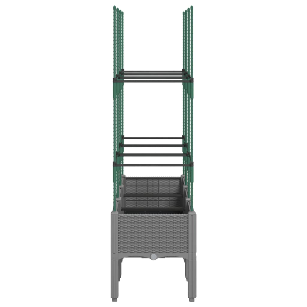 This garden planter with trellis is an excellent choice for climbing plants in your garden, patio and terrace. Durable material: Polypropylene is a popular plastic that is also one of the most used materials in outdoor furniture. It's lightweight, tough, and resistant to impact.Generous capacity: The outdoor planter provides plenty of space for growing all your vegetables, flowers and other plants.Practical design: The ideal bottom layer helps retain moisture and allows for easy drainage. Additionally, the integrated trellis offers great support for growing climbing plants such as tomatoes, peas, and roses.Beautiful rattan look: The patio planter is designed with a rattan look, bringing an elegant charm to your living space.Elevated design: The elevated design of this planter box can protect your plants from weeds and pests.