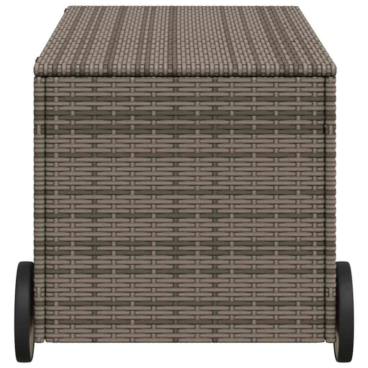 This garden storage box is ideal for storing your cushions, pillows, blankets, and other items in the garden or on the patio. Durable material: PE rattan, also known as poly rattan, is a strong, low-maintenance synthetic material that looks like natural rattan. It's lightweight, easy to clean, and commonly used for outdoor furniture due to its durability and weather-resistant properties.Storage function with water-resistant bag: The garden furniture features a water-resistant bag for storing cushions, and other items. The inner bag can be securely fastened to the outdoor furniture with hook-and-loop fasteners for added stability.Safe and easy to open and close: The gas spring makes it easy to open the lid and keeps it from slamming shut or trapping fingers.Easy to move: The outdoor storage box is designed with 2 wheels and a handle on the one side for easy transport.Robust and stable frame: The powder-coated steel frame ensures that the garden furniture is strong and stable for daily outdoor use. Good to know:To make sure your outdoor furniture stays beautiful, we recommend protecting it with a waterproof cover.
