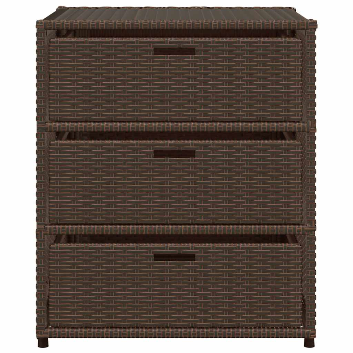 This garden storage cabinet is perfect for keeping your outdoor furniture cushions, gardening supplies, pool towels, and other items organised and easily accessible. Durable material: PE rattan, also known as poly rattan, is a strong, low-maintenance synthetic material that looks like natural rattan. It's lightweight, easy to clean, and commonly used for outdoor furniture due to its durability and weather-resistant properties.Ample storage space: This outdoor storage cabinet has 3 drawers to store your garden tools, pool toys, outdoor cushions, and more.Robust and stable frame: The powder-coated steel frame ensures the garden furniture is strong and stable for daily outdoor use. WarningTo prevent it being overturned, this product must be used with the provided wall attachment device. Good to know:To make sure your outdoor furniture stays beautiful, we recommend protecting it with a waterproof cover.