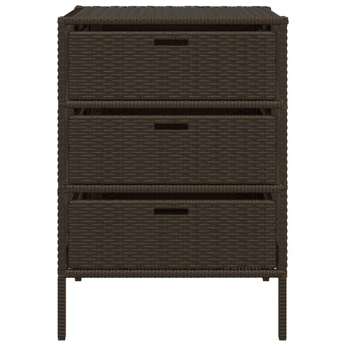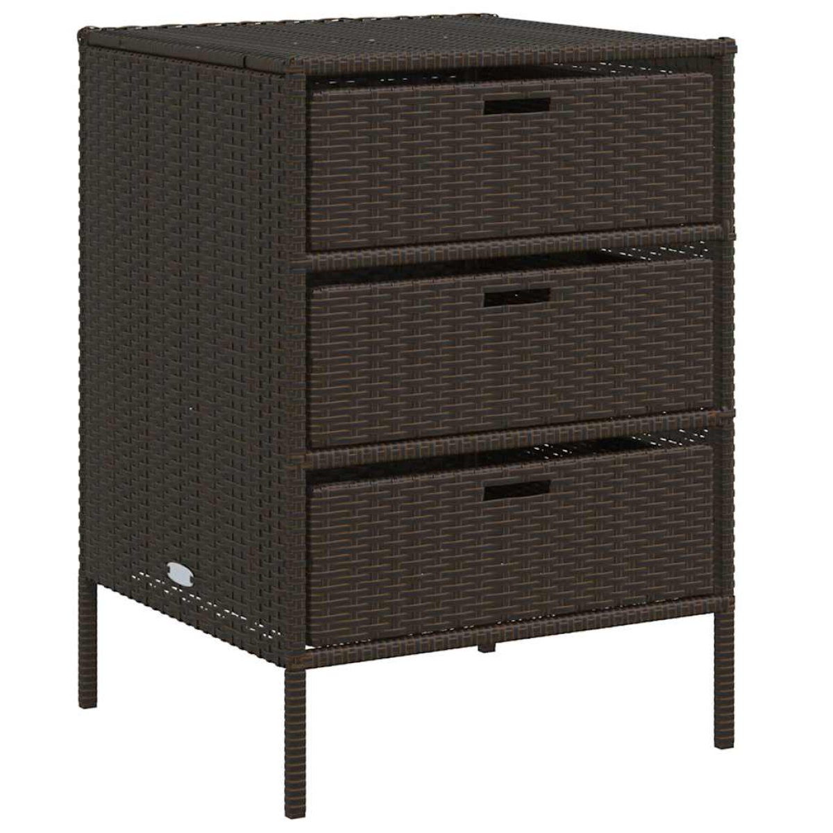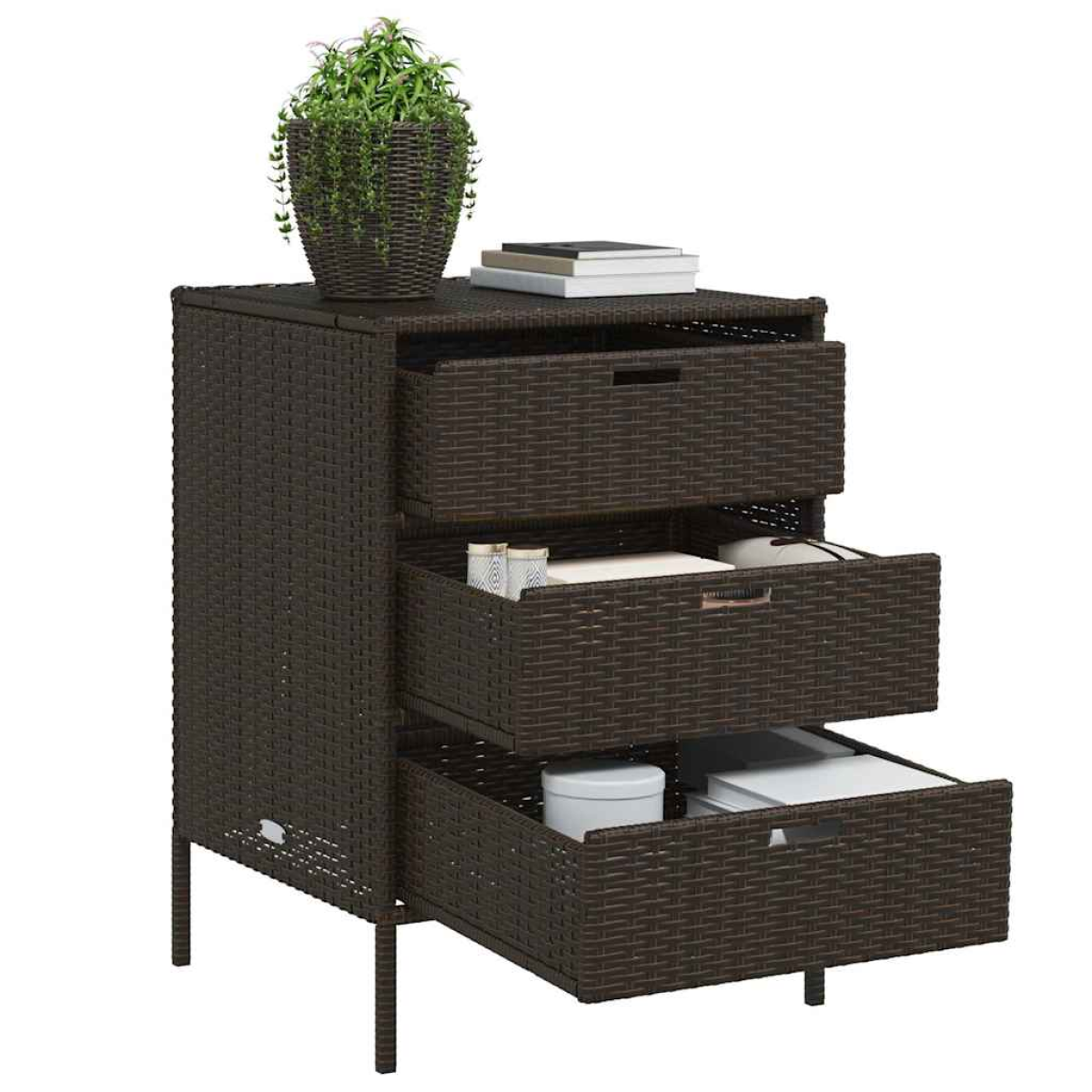 This garden storage cabinet is perfect for keeping your outdoor furniture cushions, gardening supplies, pool towels, and other items organised and easily accessible. Durable material: PE rattan, also known as poly rattan, is a strong, low-maintenance synthetic material that looks like natural rattan. It's lightweight, easy to clean, and commonly used for outdoor furniture due to its durability and weather-resistant properties.Ample storage space: This outdoor storage cabinet has 3 drawers to store your garden tools, pool toys, outdoor cushions, and more.Robust and stable frame: The powder-coated steel frame ensures the garden furniture is strong and stable for daily outdoor use. WarningTo prevent it being overturned, this product must be used with the provided wall attachment device. Good to know:To make sure your outdoor furniture stays beautiful, we recommend protecting it with a waterproof cover.