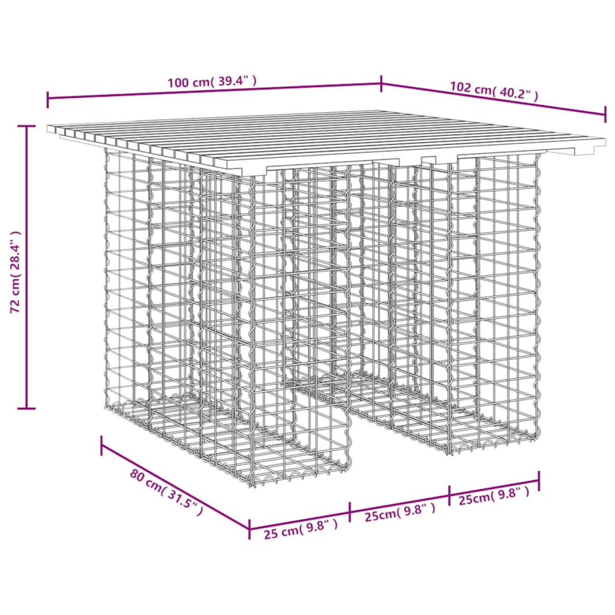 Create your own outdoor space with this garden table! This garden table will be a real eye-catcher in your outdoor living space. Solid pinewood: This top of the garden table is made of solid pinewood for durability. Solid pine wood is a beautiful natural material. It has a straight grain, and the knots give the material its signature, rustic look.Sturdy and stable base: This outdoor table features a galvanised steel gabion basket base that is designed to be filled with rocks and gravels for additional beauty. The mesh grid of gabion basket is welded with transverse and longitudinal wires at every intersection for extra stability.Compact design: This garden table is perfect for a limited space thanks to its narrow and compact design.Wide range of uses: This patio table is suitable for gardens, backyards, patio spaces, secret corner locations and more. Good to know:To make sure your outdoor furniture stays beautiful, we recommend protecting it with a waterproof cover.