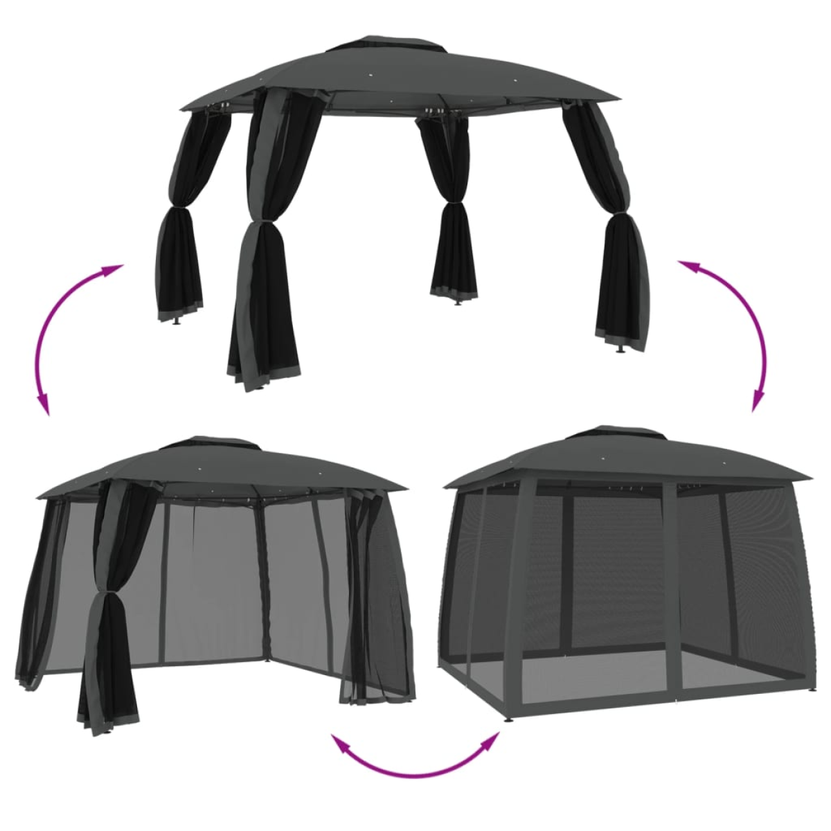 Create unforgettable moments: gather, relax, and enjoy family time under your gazebo! Robust and durable frame: Made of rust-resistant steel, the frame is appreciated for long-term outdoor use. It guarantees stability with solid beams to support the roof and reinforced stands.Ample space: The entire gazebo tent is large enough to accommodate your family and guests. You are also free to add dining tables inside.2-tier vented roof design: The gazebo adopts an elegant 2-layer design for great ventilation and stability, keeping you cool on sunny days and strengthening wind resistance during bad weather.Sun and rain protection: The sloping roof is made of durable polyester with a beautiful eave design, which is water and UV-resistant, creating an ideal spot for outdoor activities. Compared to flat roofs, it prevents rainwater from accumulating and prolongs the service life.Breathable mesh sidewalls: Mesh walls provide you with good air circulation while allowing you to enjoy a relatively private atmosphere with your family and friends. Additionally, they can effectively protect you from pesky insects, providing a comfortable resting space. Zippers make it simple to get in and out. Good to know:This product is not suitable to use in bad weather conditions such as strong wind, heavy rain, snow, storm, etc.