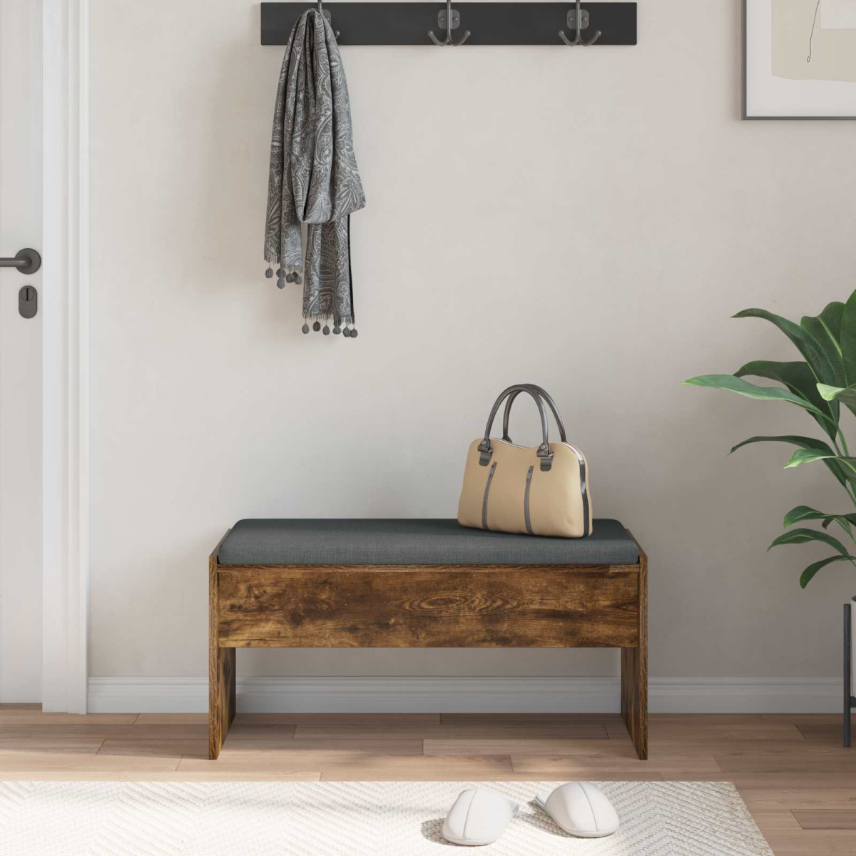 This Modern Hall Bench blends style and function, offering a sleek, rectangular shape that enhances any hallway or entryway. Its clean lines and minimalist design channel a contemporary aesthetic, making it ideal for those who appreciate simplicity and functionality in their home decor. Whether it's an entryway or a hallway, this bench provides seating and visual appeal, inviting family and guests to relax in a warm, comfortable space. Materials: The bench is crafted using engineered wood that provides both stability and a visually appealing wood grain. Its construction ensures longevity, making it a reliable addition to any home. The sleek wood surface highlights the bench's modern design, offering both resilience and an attractive finish. Soft Cushion: Equipped with a bench cushion that spans across the seating area, this bench invites users with its soft and comfortable cushioning. The fabric used adds an inviting texture, turning any waiting or resting experience into utter comfort, suitable for everyday use. Durable Construction: Designed with a long-lasting build, this bench ensures steadfast support for users. With square legs made from engineered wood, it promises a sturdy base, making it an optimal choice for a robust, yet sophisticated piece of furniture. Simplicity &Functionality: Embracing a modern style characterized by clean lines and minimal ornamentation, this bench offers a functional design that integrates smoothly into contemporary homes. It's the perfect piece for those valuing efficient space utilization without compromising style. Care &Maintenance: Maintenance is a breeze; simply wipe with a damp cloth to keep it looking pristine. No complex cleaning is necessary, ensuring the bench remains an elegant fixture in your home with minimal effort.