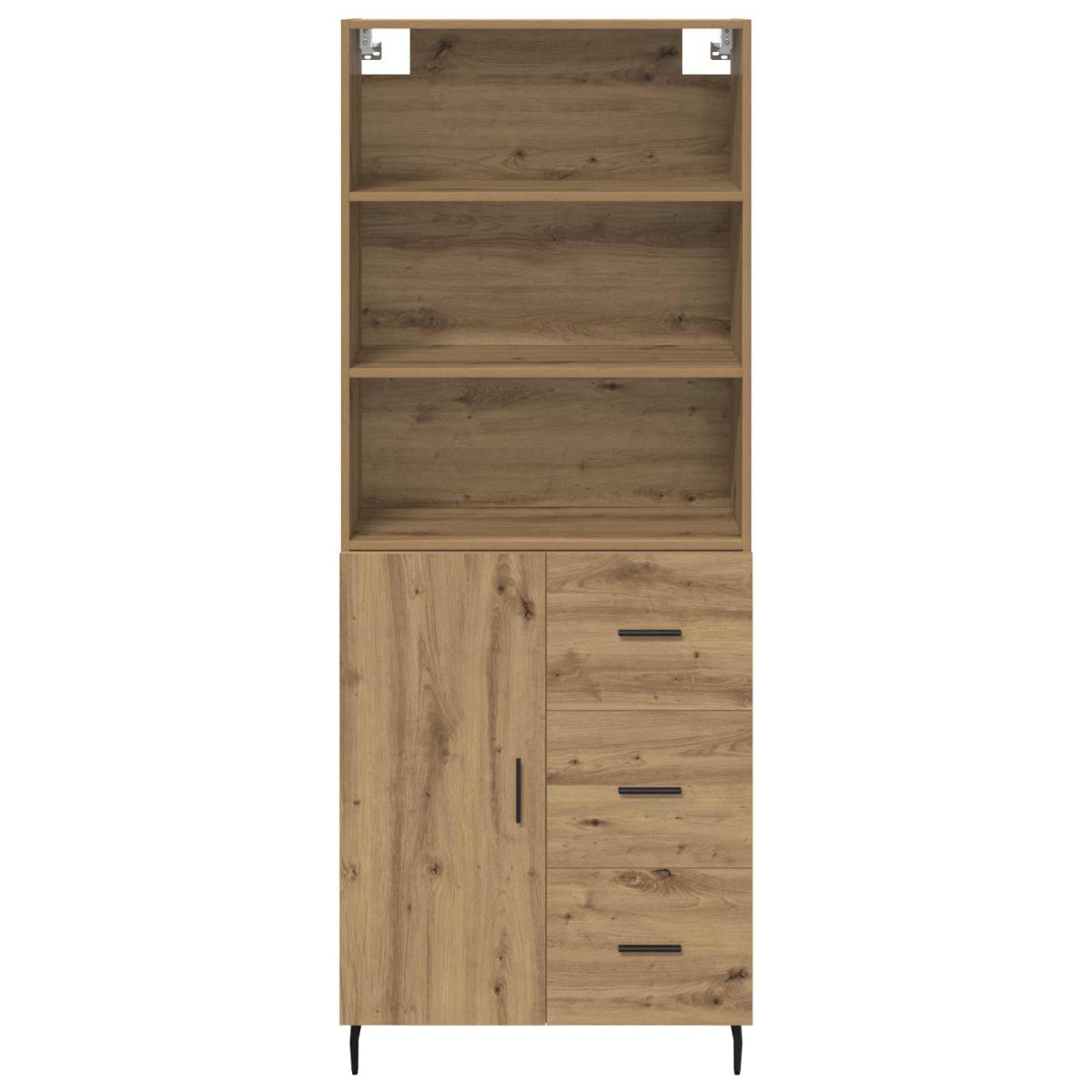 This Modern Highboard is a sleek storage solution for contemporary homes. Designed with simplicity and functionality in mind, it features an elegant aesthetic that complements a variety of interior styles. Ideal for use in living rooms and dining areas, this highboard brings a clean, organized, and sophisticated vibe to any space. Its rectangular shape and quality construction provide both visual appeal and robust storage capabilities, making it an essential piece for those who value order and modernity. Materials: The highboard is crafted from engineered wood, known for its robust and reliable nature. Complementing this is the secondary use of glass, adding a touch of elegance and transparency. Together, they offer a balanced mix of durability and style, ensuring the unit remains a functional centerpiece in any room. Included Components: Featuring iron handles and tapered iron legs, this sideboard guarantees strength and stability. The board shelves inside provide ample storage for various items, enhancing the practicality of the unit. The back is finished and presentable, allowing the unit to stand freely as a room divider if desired. Features /Function /Design: The highboard's ample storage is perfect for organizing personal items, dining ware, or decorative pieces, making it a versatile addition to any room. The modern design with clean lines and minimal ornamentation ensures it fits effortlessly into contemporary environments. Recommended Uses: Ideal for use in the living room or dining area, this highboard offers adaptable placement possibilities. Whether used to store fine china or showcase decorative art, its functionality enhances both residential and hosted spaces. Care &Maintenance: Assemble the unit following the provided instructions, ensuring you secure tall furniture to a wall to prevent tipping. Regularly dust surfaces and use recommended cleaning methods to maintain the unit's appearance and longevity.