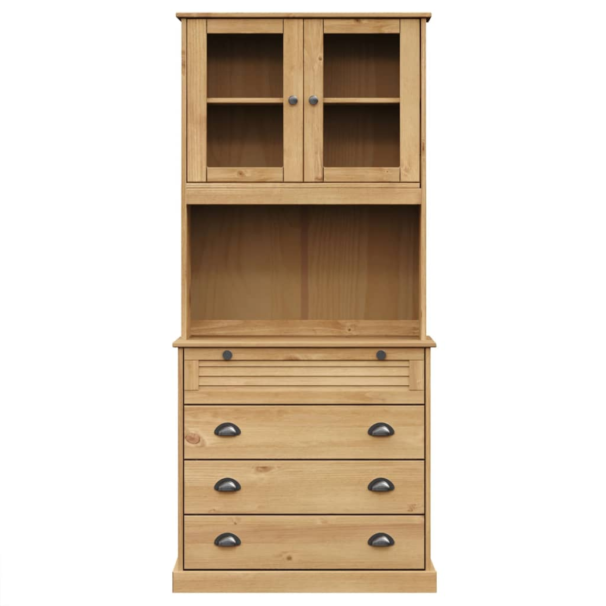 Are you hunting for a stylish highboard? This highboard adds an elegant charm to your existing interior! Solid pine wood: Solid pine wood is a beautiful natural material. Pine wood has a straight grain, and the knots give the material its signature, rustic look. Made of solid pine wood, the sideboard is durable and sturdy.Ample storage space: The cabinet has drawers and compartments, providing ample space for keeping your collection of cups, dishes and small decorative items in good order.Glass doors: The doors of this wooden cabinet top have increased robustness and safety thanks to their tempered polished glass. And it allows you to see inside the top half to display items beautifully.Easy to maintain: The buffet cabinet is easy to clean with a damp cloth and requires less maintenance.Metal handles and knobs: The tall cabinet comes with metal handles and knobs that make it easy to open and close the cabinet, while adding to the extra beauty. Warning:To prevent it being overturned, this product must be used with the provided wall attachment device.
