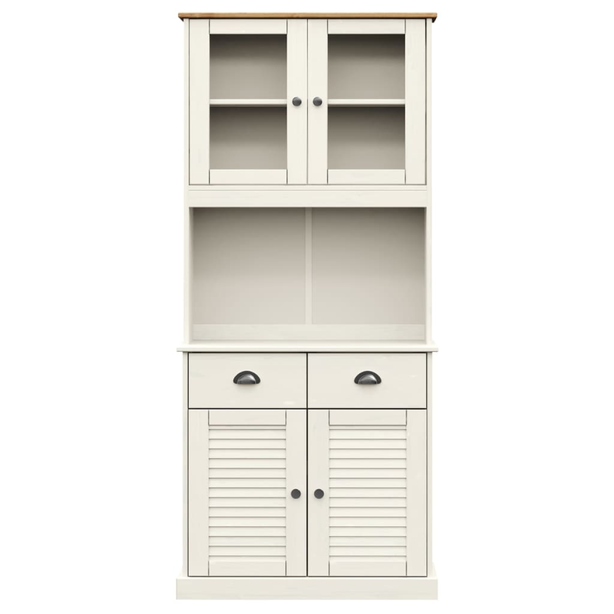 Are you hunting for a stylish highboard? This highboard adds an elegant charm to your existing interior! Solid pine wood: Solid pine wood is a beautiful natural material. Pine wood has a straight grain, and the knots give the material its signature, rustic look. Made of solid pine wood, the sideboard is durable and sturdy.Ample storage space: The cabinet has drawers and compartments, providing ample space for keeping your collection of cups, dishes and small decorative items in good order.Glass doors: The doors of this wooden cabinet top have increased robustness and safety thanks to their tempered polished glass. And it allows you to see inside the top half to display items beautifully.Easy to maintain: The buffet cabinet is easy to clean with a damp cloth and requires less maintenance.Metal handles and knobs: The tall cabinet comes with metal handles and knobs that make it easy to open and close the cabinet, while adding to the extra beauty. Warning:To prevent it being overturned, this product must be used with the provided wall attachment device.
