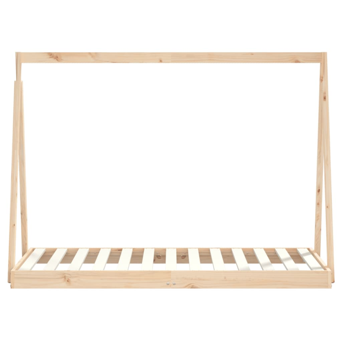 Whether it's planning their next adventure or nodding off to sleep, your little one will love this fantastic wooden kids bed frame! Solid pine wood: The kids bed frame is made from solid pine wood. Solid pine wood is a beautiful natural material. Pine wood has a straight grain, and the knots give the material its signature, rustic look.Sturdy slats: The bed for kids has wooden slats for firm support, ventilation and stability.Tipi bed design: This toddler bed features a novelty crossover framework inspired by the cool tipi-style tents where you can hang bed curtains to create privacy for your kid.Considerate design: The kids single bed frame is directly on the ground, which prevents your younger child from getting hurt or strained when rolling and climbing in or out.