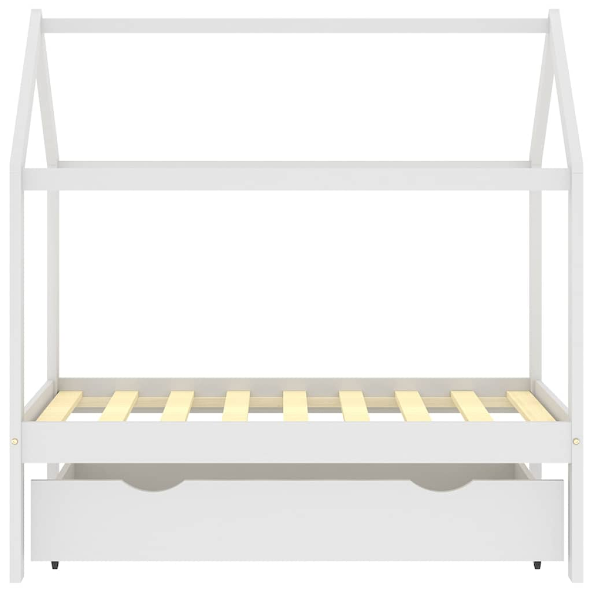 This wooden kids bed frame with a drawer is a practical and decorative addition to any bedroom decor. The bed is smartly designed with a tree house style frame where you can hang bed curtains to create privacy for your kid. It can also be used as a reading book or a play house for your child. Made of solid pine wood, this bed frame is exceedingly sturdy and durable. The strong slats offer the needed support and are highly comfortable. The included bed drawer with 2 handles provides ample storage space for storing folded clothes, toys, etc., keeping your room clean and tidy. The easy-glide wheels can work on both carpeted and wooden floors. This bed frame is suitable for a mattress of 70 x 140 cm. Please note that delivery includes a bed frame only; a mattress and curtains are not included. The bed is easy to assemble. You can check our shop for the matching mattresses.