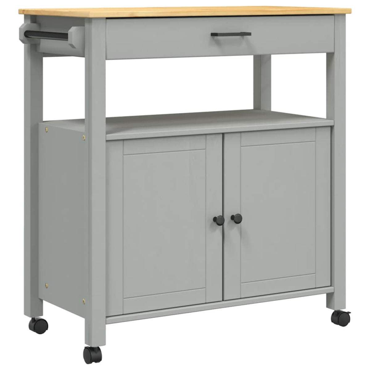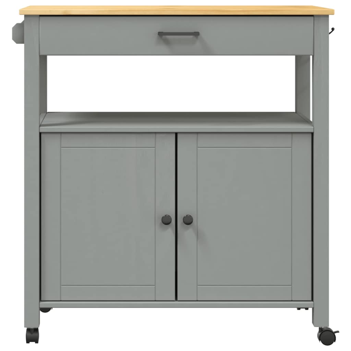 Create a distinctive and vintage touch and add more storage space to your kitchen with this wooden kitchen trolley! Durable material: Solid pine wood is a beautiful natural material. Pine wood has a straight grain, and the knots give the material its signature, rustic look. Made of solid pine wood, this kitchen storage trolley is durable and sturdy. Ample storage space: This vegetable trolley is designed with a drawer and 2 doors, which offer ample storage space to place kitchen utensils. And the wooden hanger and metal hooks on the side can keep your things at hand. Easy to move: This food trolley has 4 wheels and 2 of them are lockable, making it move flexibly and park stably at any time. Wide applications: This organiser trolley can be placed in the kitchen, living room, bathroom, study, and other places. You can use it to place daily items, spices, toiletries, books, and other things to improve the cleanliness of your home.