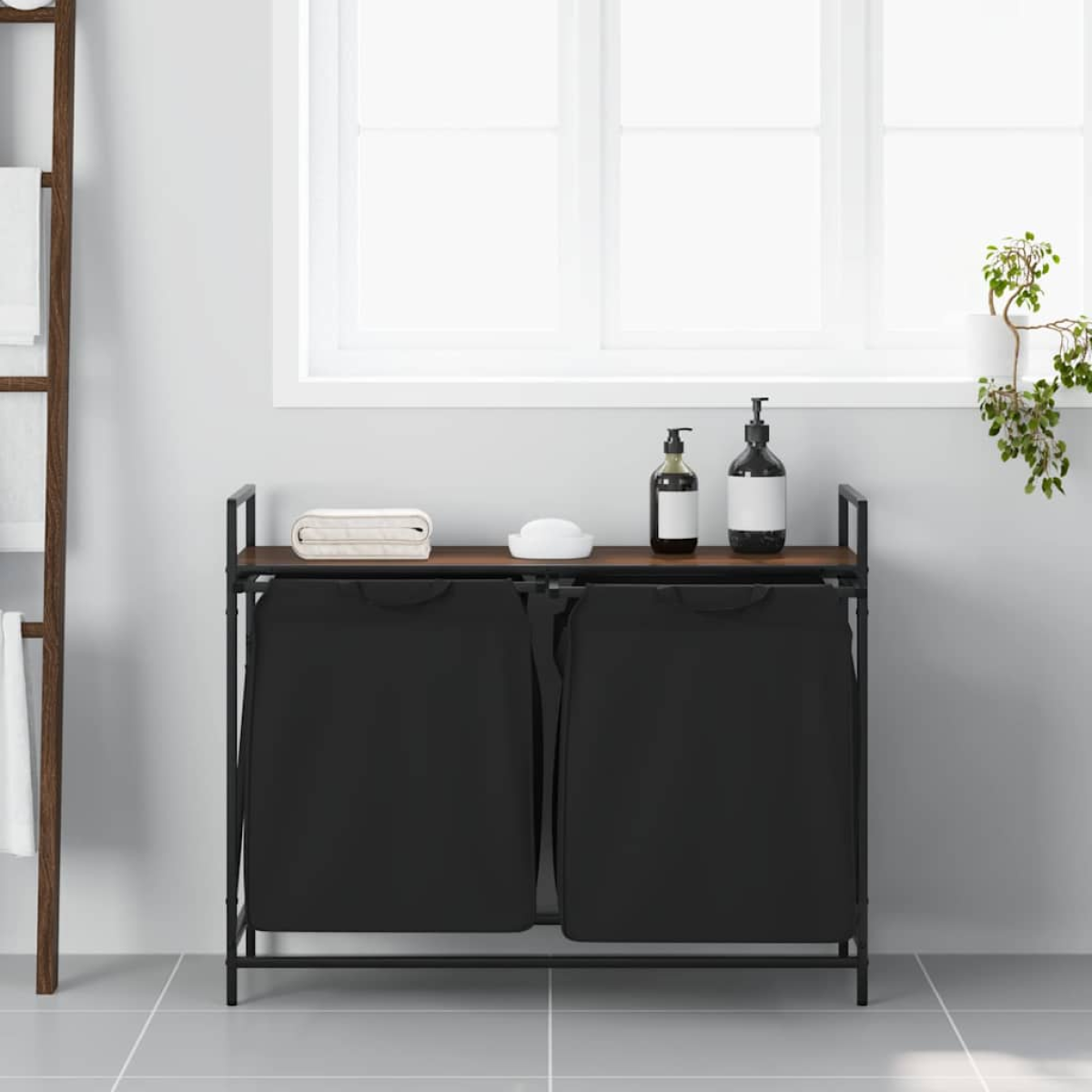 The laundry basket provides a spacious and convenient storage solution, with pull-out bags that make organising your laundry effortless. Laundry sorter: Designed to offer a generous load of laundry per bag, this organiser helps categorise garments by colour or fabric type, maintaining a clutter-free laundry area, and also storing toys and more.Convenient pull-out laundry bags: The removable laundry bags are designed with pull-out handles and hook-and-loop fasteners for easy detachment and pulling. The reinforced bottom panels help maintain the bags' shape and prevent sagging.Robust and durable structure: This laundry basket combines a steel frame with durable engineered wood, offering excellent strength, wear resistance, and stability.Top storage surface: The laundry basket features a top shelf, offering a practical solution for keeping your essentials within easy reach. Perfect for storing toiletries, laundry detergents, fabric softeners, or even decorative items.Versatile and multifunctional: Perfect for the laundry room, bathroom, or bedroom, this unit seamlessly blends functionality with style, keeping your home tidy and organised while complementing various décor themes. Warning:To prevent it from tipping over, this product must be used with the provided wall attachment device.