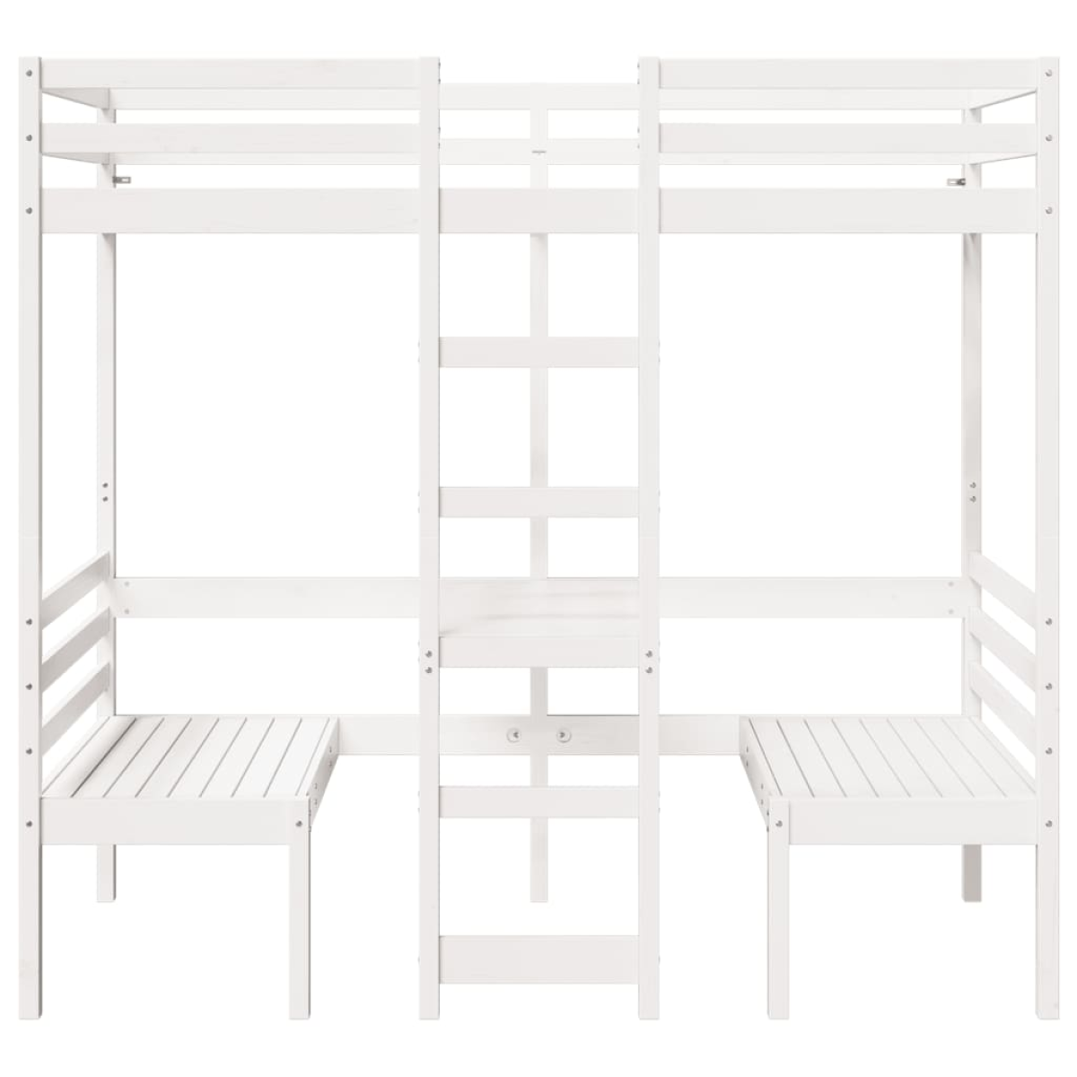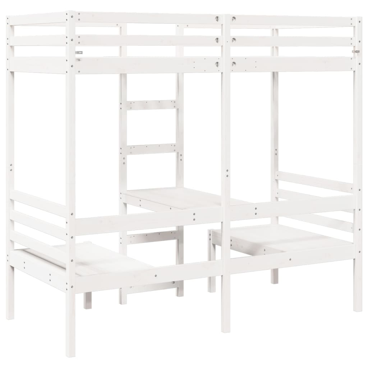 This versatile loft bed integrates a single bed with a desk and chairs, providing a cosy sleeping space, and a spacious work area. It is an ideal choice for homes with limited space.Stable and long-lasting frame: Solid pinewood is known for its strength and durability. Its straight grains and distinctive knots contribute to its rustic charm.Maximise space utilisation: This bed frame features a desk and two chairs underneath, effectively utilising the under-bed space to provide a cosy space for working and studying. It is an ideal choice for smaller or more confined areas.Easy to climb up and down: This bed frame features a built-in ladder, providing convenient access for users to climb up and down.Guardrails for enhanced safety: This bed frame is equipped with guardrails to prevent you from falling out of bed while sleeping.Slatted base for optimal support: The bed frame is equipped with a slatted base for support and breathability for your mattress.Warning:To prevent it from tipping over, this product must be used with the provided wall attachment device.Good to know:A mattress is not included with this bed. We do offer a various selection of mattresses. You can check our shop for a matching mattress.Screws and plugs for inside the wall are not included. We advise to find and use screws and plugs suitable specifically for your walls. If you're not sure, you can consult with a professional. Please read and follow each step of the instructions.