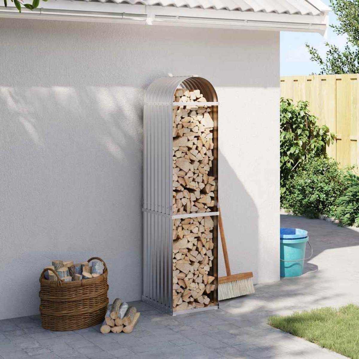 This log holder is an ideal solution for neatly storing your firewood. It is a must-have for anyone with a fireplace or log burner to keep firewood collected and easily accessible. Sturdy and robust: This fireplace log store is constructed from heavy-duty steel sheets, ensuring it is both stable and long-lasting. Additionally, it is coated with a galvanisation finish to protect it from harsh weather conditions, making it an ideal choice for outdoor use.Ample storage space: This fireplace log holder has ample space to accommodate a large quantity of logs, ensuring you can easily replenish the fire and stay warm during the winter months.Good ventilation: The wood storage keeps logs off the ground to improve ventilation and keep the firewood dry.Extra stability: This firewood rack is equipped with a hook, allowing you to secure it against the wall for enhanced stability and safety. Warning:In order to prevent overturning, this product must be used with the wall attachment device provided.Good to know:To prevent damage from heavy snow buildup, we recommend clearing the roof regularly during winter.