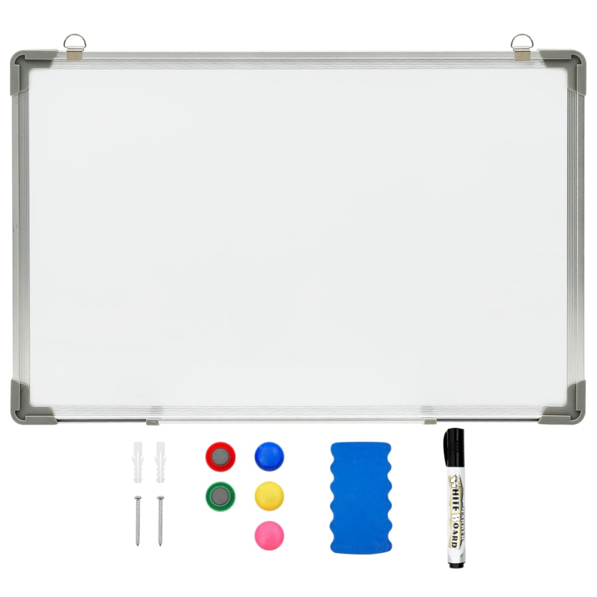 Our wall-mounted magnetic whiteboard is an ideal solution for creating a central place in your home or office to write notes, doodle, or display photos. The whiteboard has a lacquer-coated steel surface which is easy to write and clean with the included marker and eraser. The aluminium frame and the corner protector make it sturdy and durable. You can hang the item with the included magnets. Hooks and nails are included for easy mounting to the wall.