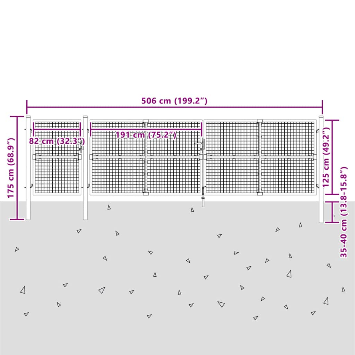 The garden gate is a great combination of strength, stability, and corrosion resistance! It will surely be an ideal entry point for your garden, patio, or terrace! Durable material: Steel is an exceptionally hard and strong material. It offers sturdiness and stability. Galvanisation provides better protection against corrosion and is useful for products that'll be used outdoors as well as in harsh environments.Lockable design: The outdoor gate has a ground stake for the large bottom bolt, which ensures the patio gate can be locked well.Easy assembling: The steel garden gate has two side posts with bolt hinges for easy installation.