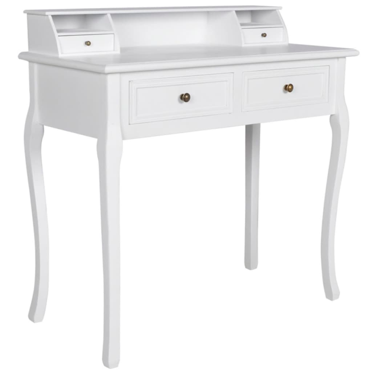 This beautiful vanity table will titivate your bedroom or dressing area! There are two connecting drawers on each side adjoined to the table top to hold your valuables. In addition, you will find two full-sized drawers on the lower portion of the table for extra storage space. The drawers can be easily removed for cleaning. The soft white finish and the sleek shaped curved legs provide luster and classiness. This list is for one vanity table. Check our other products for a matching stool, mirror and more! Please note that since this furniture is hand-crafted, made of wood and painted white, it may come with small defect.