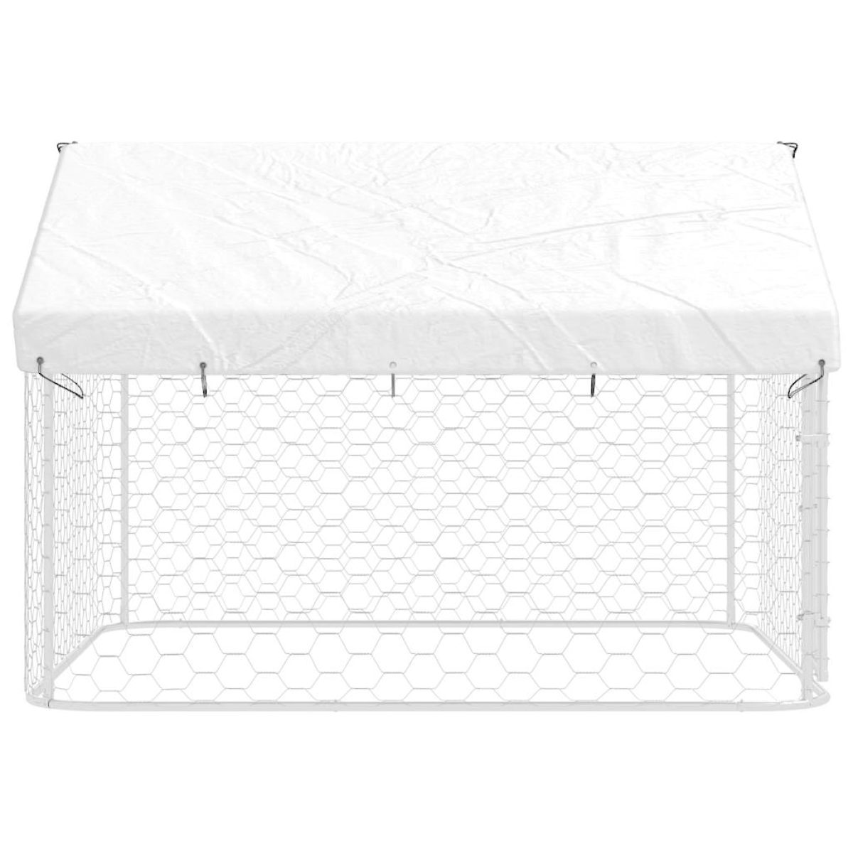 Provide safety, security and comfort for your puppy with this outdoor dog kennel. This versatile dog house features multiple uses: playing, exercising, training, or simply keeping your dog safe. It will be the perfect play paradise for your furry friends! This large dog kennel provides ample exercise space while the mesh all around helps prevent mischief and unexpected accidents while enabling ventilation. Thanks to the sturdy and heavy-duty galvanised steel construction, this quality dog kennel is durable and built to last. Made of 100% polyethylene, the included top canopy is fire-resistant and UV protected, providing protection from sun, rain, snow, as well as other weather conditions. The hinged door with lockable latch system ensures extra security and safety for your dogs.