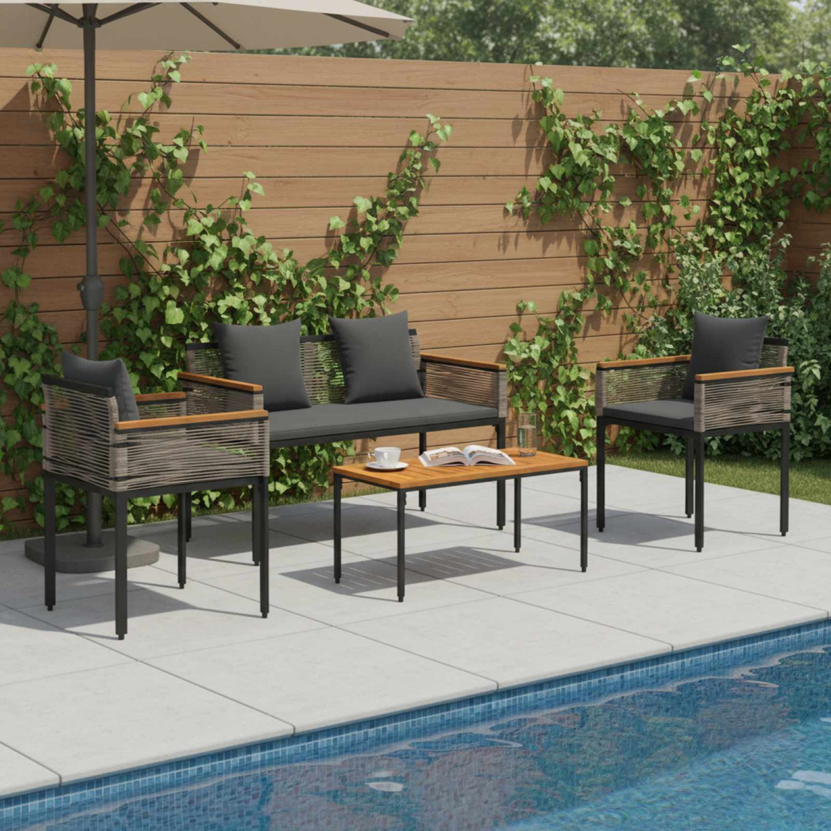 This Modern Outdoor furniture set brings aesthetic charm to any garden or terrace. Designed with a rustic style, it features a harmonious blend of natural beauty and sturdy construction for an inviting atmosphere. Whether hosting friends or enjoying a quiet moment alone, its stylish, comfortable appearance makes it the ideal choice for any outdoor setting. Its carefully crafted components, including the beautifully carved armrests and solid frame, create a perfect balance of functionality and design, enhancing the usability and appeal of your space. Premium Materials: Constructed from PE Rattan and powder-coated steel, known for durability and resilience against harsh weather conditions. The unique combination ensures both the natural look of rattan and long-lasting structural integrity. These materials withstand outdoor elements, providing reliability and comfort in various climates. Quality Components: The set includes a boxed cushion with a zipper closure for easy removal and cleaning. It features lightweight foam and fiber filling for added comfort. The square leg design, combined with finely carved, wooden armrests, provides optimal support and style. Ergonomic Features: Includes levelers that stabilize the furniture, allowing for adjustment on uneven surfaces for a comfortable seating experience. This intelligent design addresses common issues faced in outdoor environments, ensuring that every interaction is pleasant and comfortable. Functional Uses: Suitable for gardens and terraces, it provides a charming setting for gatherings or relaxation. Its rustic aesthetic complements various outdoor environments, making it a versatile addition to your home's aesthetic and functionality. Care Instructions: To maintain its pristine condition, avoid harsh chemicals, and wipe with a dry cloth. When not in use, employ a cover to shield against outdoor elements, thus enhancing the longevity of the furniture and retaining its visual appeal over time.