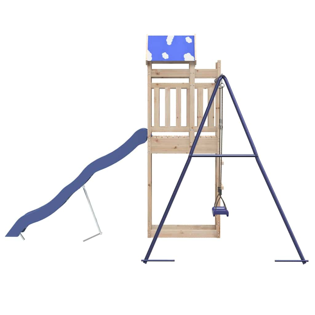 Do you want to give your children the freedom to play at home? This wooden outdoor playset transforms your backyard into a playground for imaginative adventures! Durable material: This garden playset frame is made of solid pine wood. Solid pinewood is known for its strength and durability. Its straight grains and distinctive knots contribute to its rustic charm.Stable wooden frame: The wooden frame of the garden playhouse ensures sturdiness and stability. In addition, the "A" shaped legs of the children's swing allow for balance.Multi-activity centres: The climbing frame features a 118 cm height platform and stands out with its wave slide, a single swing as well as a sandpit. Your little ones can also invite their friends to join the fun.Thoughtful design: The surrounding wooden railings are designed to ensure the safety of children during their happy play. Also, the cloud roof provides shade for your children on hot summer days.Endless fun: This fun-filled wooden outdoor playset is the perfect way for your children and their friends to enjoy entertainment, have more interactive time and make memories for you and your children! Warning:Only for domestic useOutdoor useNot suitable for children under 3 yearsRecommend user age: 3-8 years old