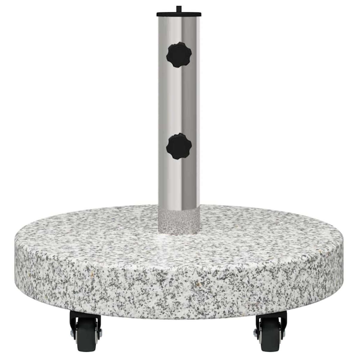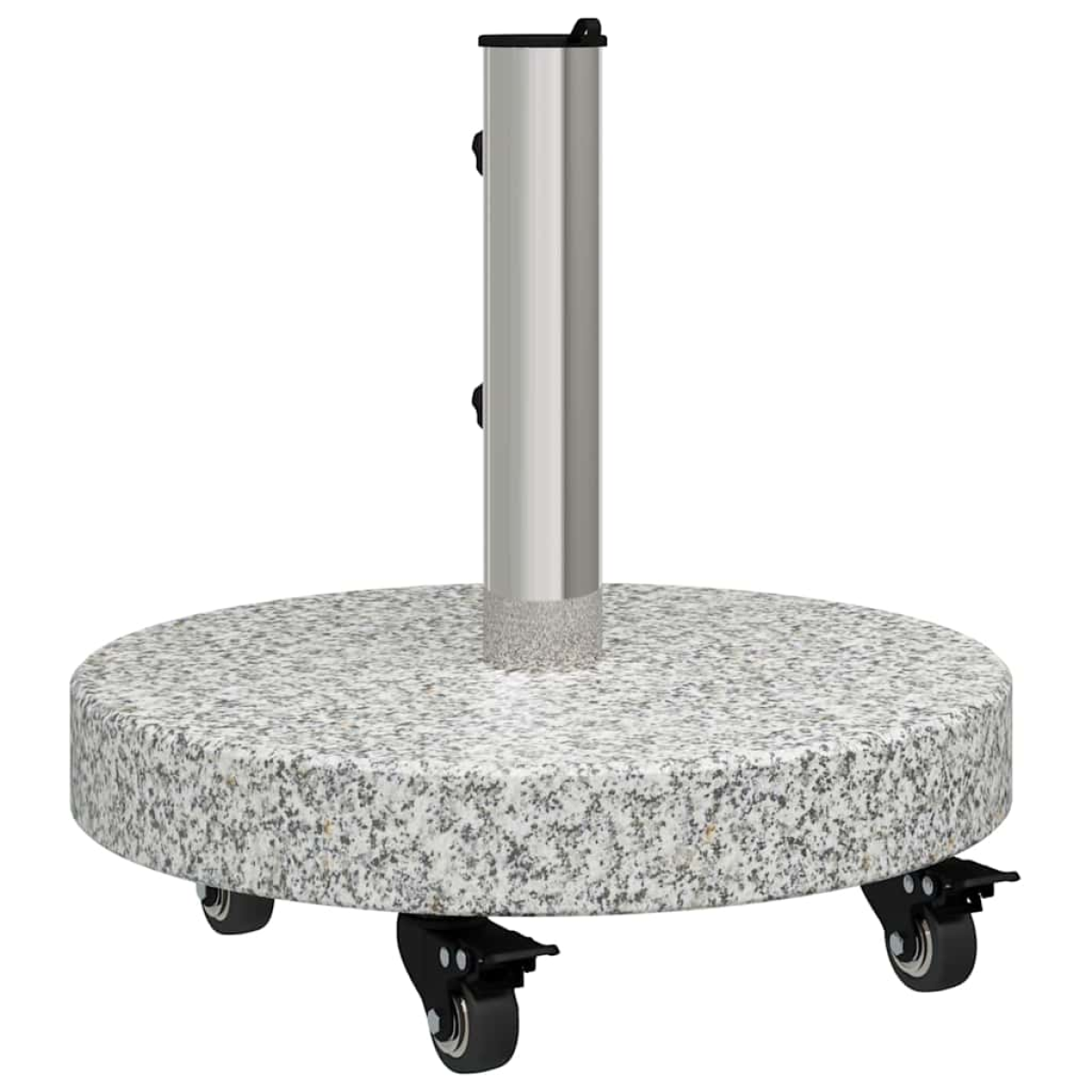 This Round Parasol Base is a stylish and practical solution designed for outdoor settings like gardens and terraces. Crafted with a modern touch, its design is characterized by simplicity and functionality, making it an ideal match for seasonal summer arrangements. Its round granite base provides a stable foundation, while the incorporated stainless steel enhances durability, ensuring your parasol remains steadfast throughout various weather conditions. The rollable feature facilitates easy movement, offering users flexibility in repositioning it effortlessly by hand. Granite and Stainless Steel: The parasol base features a robust granite foundation that ensures stability even in breezy conditions. Paired with stainless steel, it not only promises exceptional durability and resistance to but also adds to the modern aesthetic. This combination ensures effective performance and longevity, even with regular exposure to sun and weather. Rollable Feature: Designed with an easily rollable mechanism, this parasol base offers enhanced mobility, making repositioning effortless. The manual rollable design allows users to adjust the base’s location to accommodate shifting sunlight or various events in the garden or terrace, providing convenience and versatility in practically any outdoor setting. Simple Assembly: The parasol base requires straightforward assembly by one person using a screwdriver, making it simple to set up and use without complex instructions. Assembly involves connecting essential components to ensure optimal stability while maintaining its sleek design. Outdoor Use Optimized: Specifically intended for outdoor use, this base complements seasonal decor on patios and in gardens. Its materials are chosen for their resilience to summer conditions, ensuring it keeps parasols secure, and its contemporary style makes it compatible with diverse outdoor furniture designs. Minimal Maintenance: Simply wiping clean with a damp cloth maintains its appearance. The choice of granite and stainless steel minimizes potential weathering or tarnishing, allowing you to enjoy its aesthetic and performance without fuss.