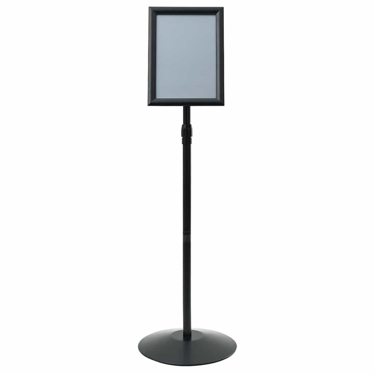 The Durable Pedestal Poster Stand is a versatile solution designed for both business and industrial environments. Emphasizing function and style, this modern display piece boasts a minimalist aesthetic, clean lines, and high functionality. With its sleek black finish, this pedestal stand can seamlessly integrate into any office setting or retail display. Ideal for showcasing promotional materials or important notices, it appeals to professionals seeking a reliable display option that effortlessly marries form and function. Premium Materials: Constructed from high-quality aluminum and PVC, the stand is both water and UV-resistant. This choice of materials ensures it maintains its appearance and integrity even when exposed to harsh elements, providing a long-lasting tool for businesses needing stable and effective displays. Adjustable Height Feature: With a manually adjustable mechanism, users can easily change the stand's height to suit varied display needs. This flexibility allows organizations to adapt to different display sizes and formats, enhancing overall utility and versatility across various applications. Robust Design: Featuring a heavy-duty metal base, the stand guarantees exceptional stability and durability. Its sleek silhouette adds to its modern appeal, effortlessly blending into offices or retail spaces. Display materials remain securely in place, ensuring a polished representation of important content. Indoor &Outdoor Versatility: Designed for use in diverse environments, the pedestal stand functions equally well indoors and outdoors. This flexibility aids businesses that require solutions capable of withstanding unpredictable weather while retaining visual appeal and practicality. Simple Maintenance: Featuring a smooth surface that resists dirt and grime, the stand requires only occasional wiping with a dry cloth to maintain its sheen. This easy upkeep extends its life and ensures it remains a key asset for various commercial purposes.