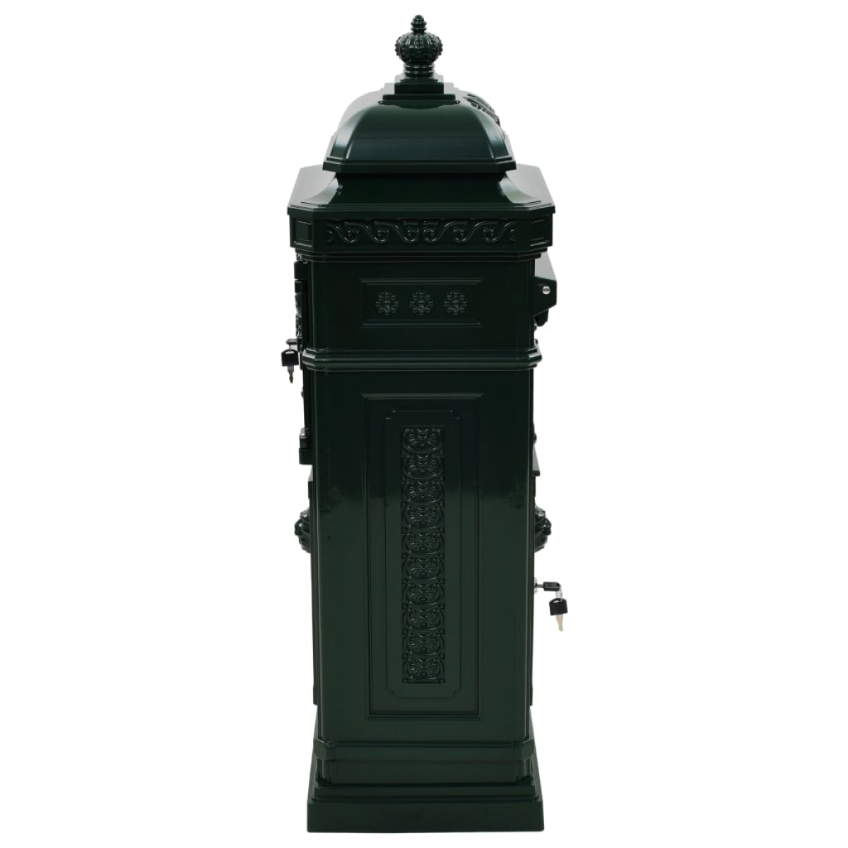 Our beautiful, antique-style pillar letterbox will make a practical as well as decorative addition to your garden or entrance at home or your place of business. This mailbox is designed with a wide mail slot that has a flap to protect the contents from the elements and two lockable doors (2 keys included for each door) for easily taking out the letters. The letterbox is made of weather-resistant and rustproof cast aluminium, which makes it very suitable for outdoor use. It is adorned with an abundance of exquisite, vintage-style decorative details and will become a real eye-catcher in your driveway or entryway.