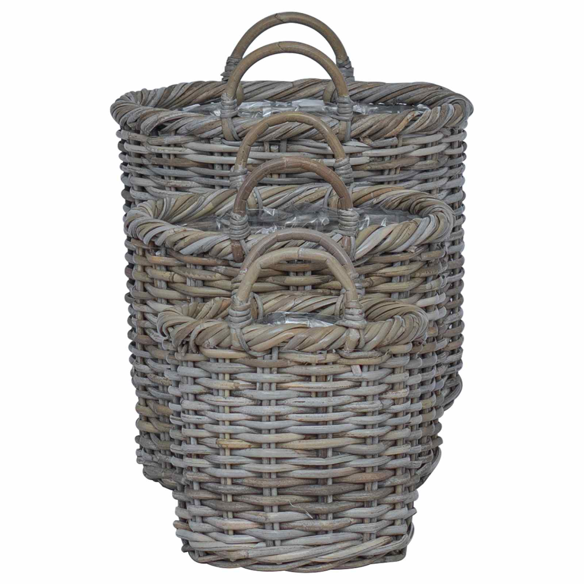This Round Baskets with Handles set is a versatile and decorative addition to any home. Ideal for both indoor and outdoor use, these baskets feature a beautifully woven texture and are perfect for stylish storage or display. Their neutral appearance and elegant design make them a great fit for various decor styles, enhancing the visual appeal of living rooms, patios, or gardens. Their practicality shines through with convenient foldable handles that offer easy portability and flexibility in usage. Elegant Woven Texture The baskets flaunt a beautiful woven design thanks to the Kubu Rattan. Their intricate texture brings a touch of sophistication to any space they occupy, contributing to an elegant and warm atmosphere. The rattan material is not only aesthetically pleasing but also ensures the basket's robustness for daily use. Handmade Craftsmanship Each basket is meticulously crafted by skilled artisans, ensuring every piece is unique and of impeccable quality. This handmade feature guarantees that the baskets have individual charm, offering an artisanal touch to your home. Foldable Handles Simplifying mobility and storage, the baskets come equipped with foldable handles. These well-designed handles, shaped like the letter 'D', make it easy to transport the baskets around your home or garden effortlessly. Versatile Dimensions Available in three different sizes, these baskets bring flexibility to your storage needs. Ideal for organizing clutter or showcasing your favorite plants, their diverse sizes allow you to use them in various scenarios successfully. Easy Maintenance Designed for convenience, the baskets require minimal care. Simply wipe with a dry cloth; harsh chemicals are unnecessary, preserving the basket's appearance and extending its lifespan.