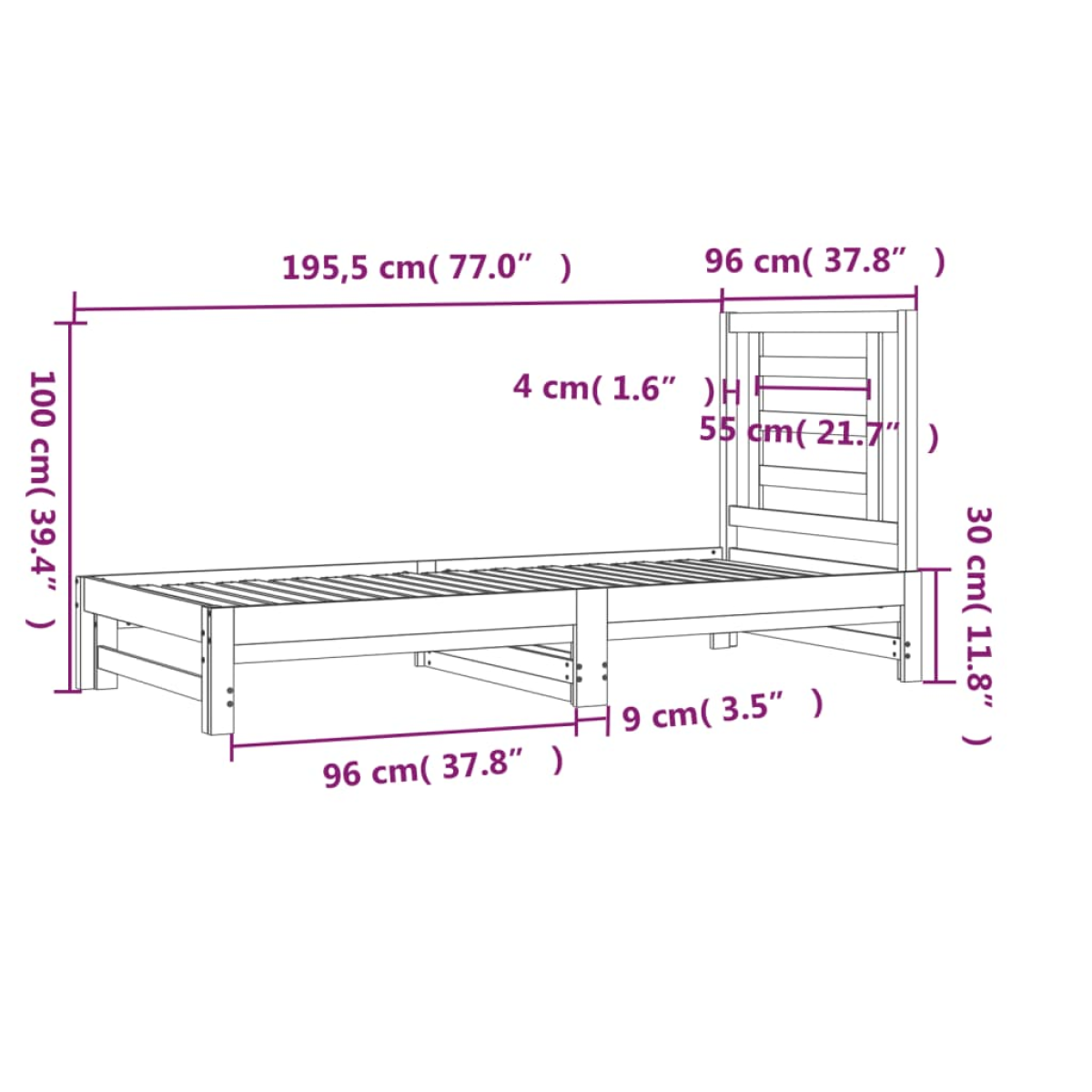 - Daybed dimensions (not extended): 195.5 x 95 x 30 cm (L x W x H)