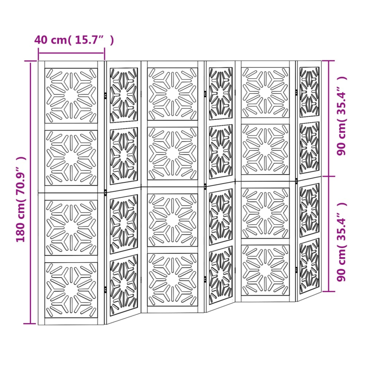 Bring elegance and an eye-catching decorative touch to your space with this charming room divider. Durable and easy to clean: The privacy screen is made from engineered wood, making it easy to clean and durable.Stable frame: The solid paulownia wood frame ensures sturdiness and stability. Solid paulownia wood is a beautiful natural material. Paulownia wood is highly resistant to bugs and rotting.Flexible and easy to fold: Each partition is connected by 3 metal hinges and the upper and lower panels are connected by hidden 2-in-1 hinges. So the room divider panel can be easily folded to some extent according to your needs to save space.Multipurpose: The room partition is great for creating private space in your bedroom, living room, office and other interiors. You can also place it in front of a window to block intense sunlightAttractive looking: Featuring a geometric cut-out design, this folding room divider adds character and decoration to the space. Warning:Only for indoor use.