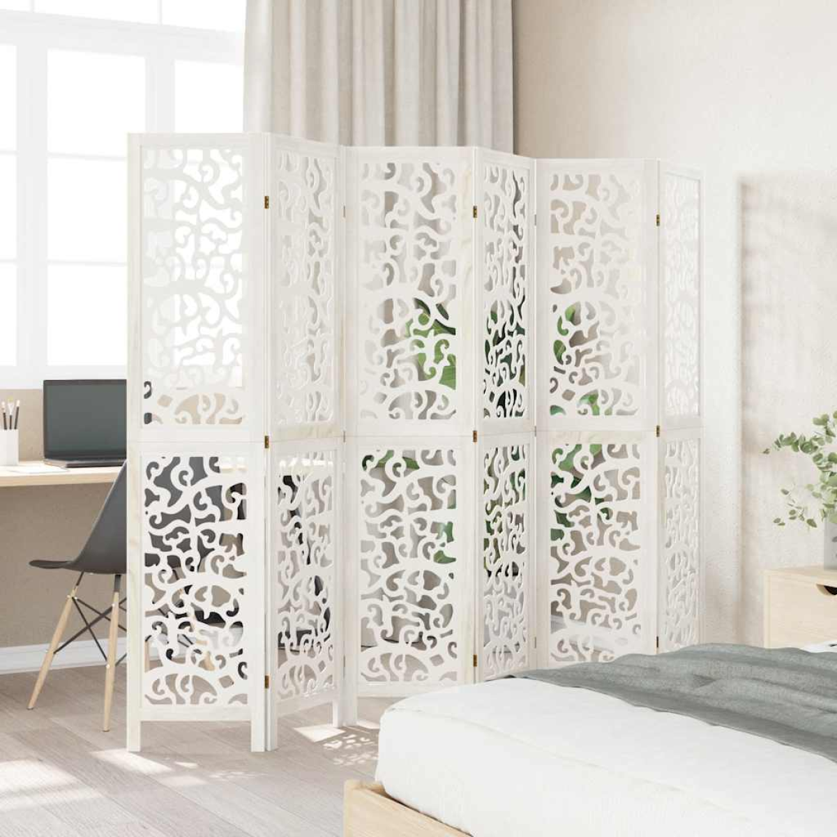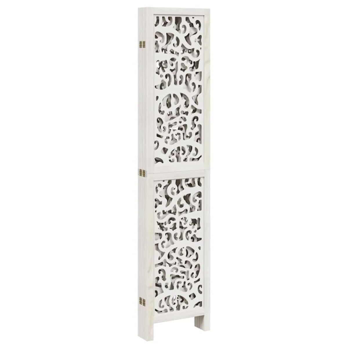 Bring elegance and an eye-catching decorative touch to your space with this charming room divider. Durable and easy to clean: The privacy screen is made from engineered wood, making it easy to clean and durable.Stable frame: The solid paulownia wood frame ensures sturdiness and stability. Solid paulownia wood is a beautiful natural material. Paulownia wood is highly resistant to bugs and rotting.Flexible and easy to fold: Each partition is connected by 3 metal hinges and the upper and lower panels are connected by hidden 2-in-1 hinges. So the room divider panel can be easily folded to some extent according to your needs to save space.Multipurpose: The room partition is great for creating private space in your bedroom, living room, office and other interiors. You can also place it in front of a window to block intense sunlight.Attractive looking: Featuring a delicate openwork looking, this folding room divider adds character and decoration to the space. Warning:Only for indoor use.