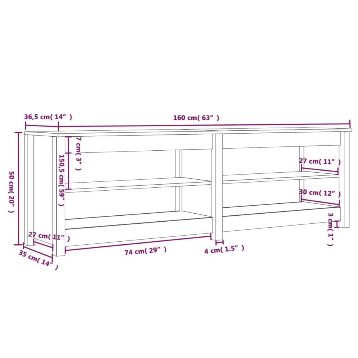 vidaXL Shoe Bench 160x36.5x50 cm Solid Wood Pine