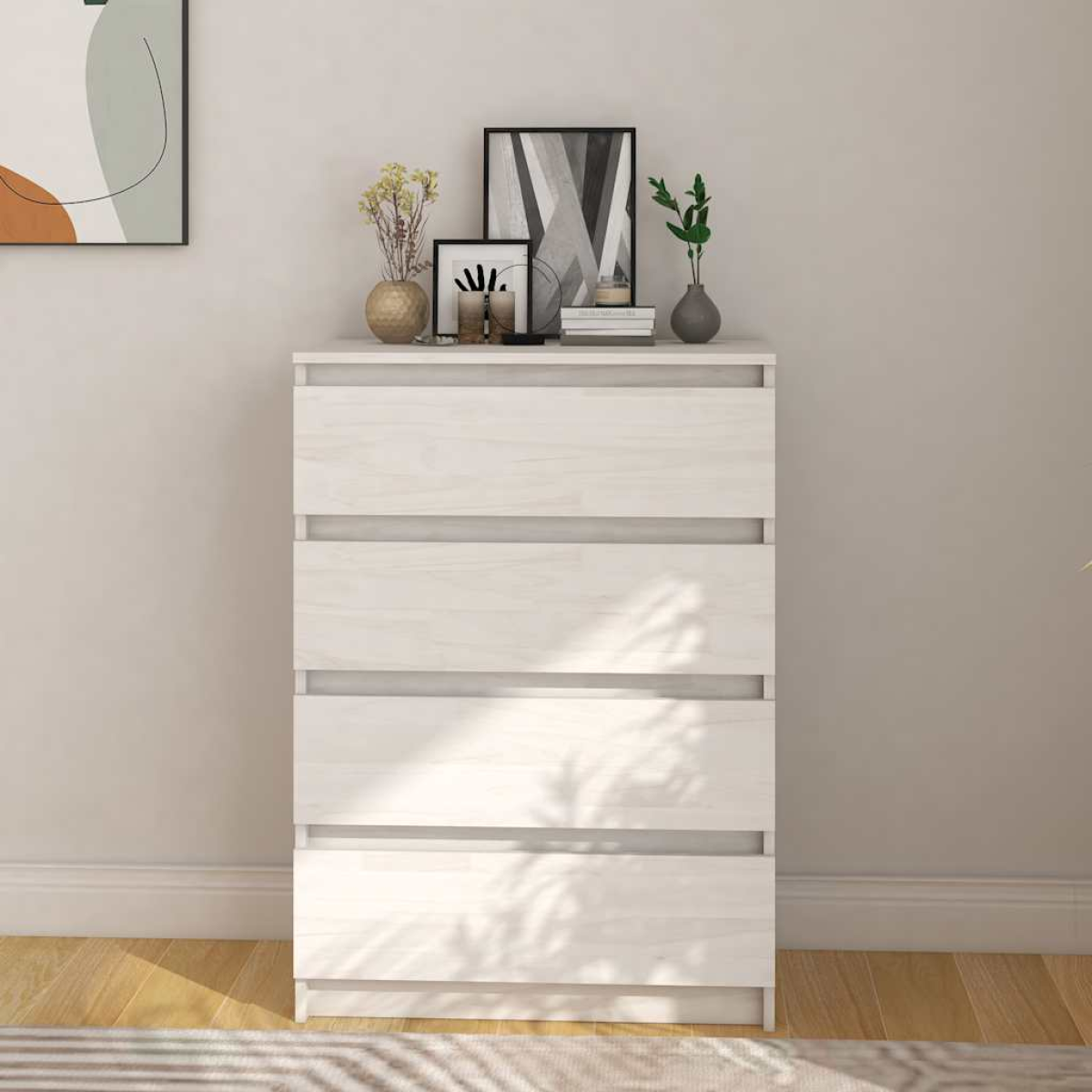 This wooden side cabinet, featuring a simple style, is meant to become an ideal complement in your room with its practical utility. The drawer cabinet is crafted from solid pinewood, making it stable and durable. With 4 drawers, the storage cabinet provides ample storage space for books, clothes, and other items. The sturdy top is also ideal for displaying decorative objects, photo frames, or potted plants.